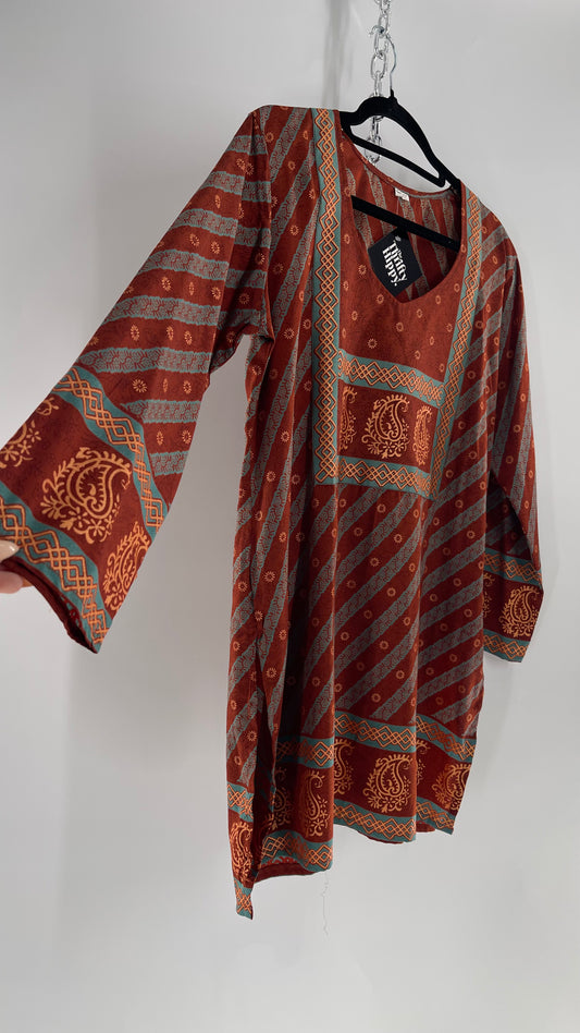 Vintage 1970s Indian 100% Silk Tunic Burnt Orange, Teal and Gold (40)