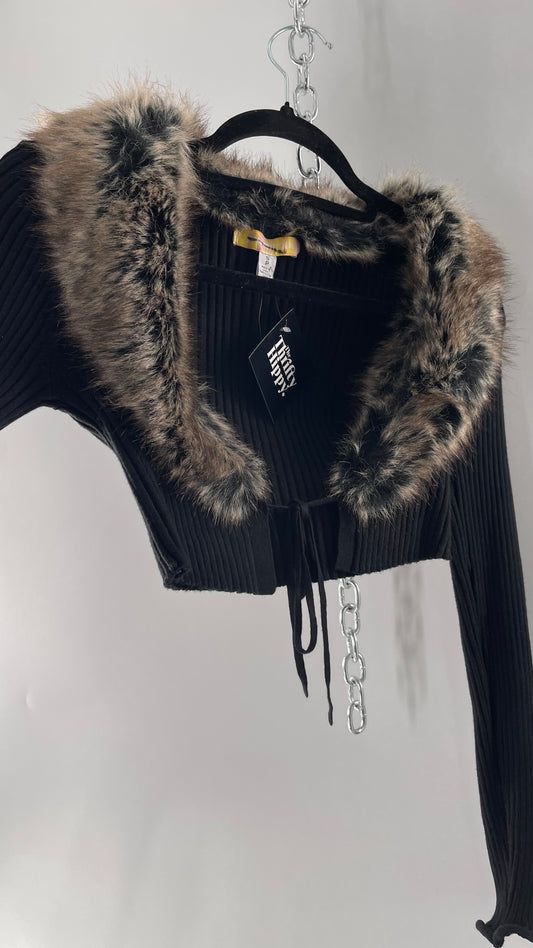 Urban Outfitters Black Knit Cardigan Izzy Ribbed Shrug with Faux Fur Collar (S)