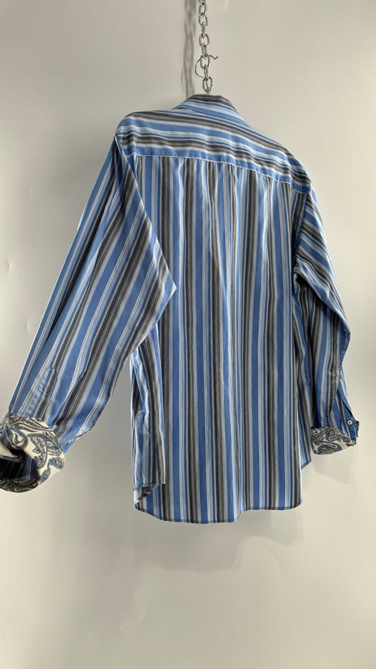 Vintage 1990s Bugatchi Men’s Blue Striped Button Up with Paisley Cuffs (Large)