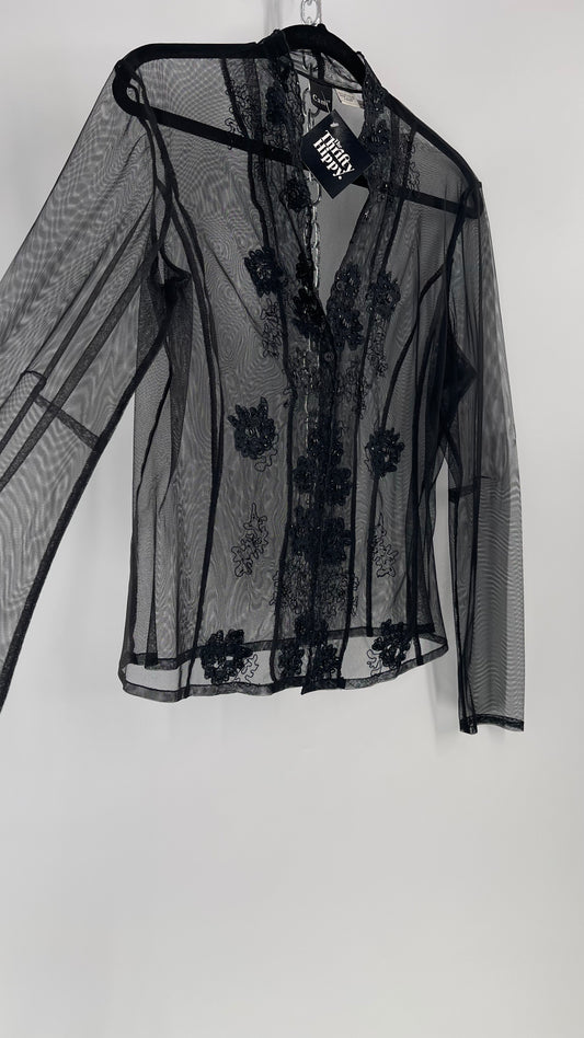 Vintage CAMI Black Mesh Long Sleeve with Embroidered and Beaded Neckline with Exaggerated Seams (Large)