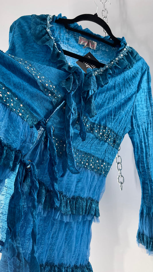 Vintage Pretty Angel Blue Long Sleeve Grommet Tie Bedazzled Blouse with Lace Ruffles and Pearlescent Beading (Large)