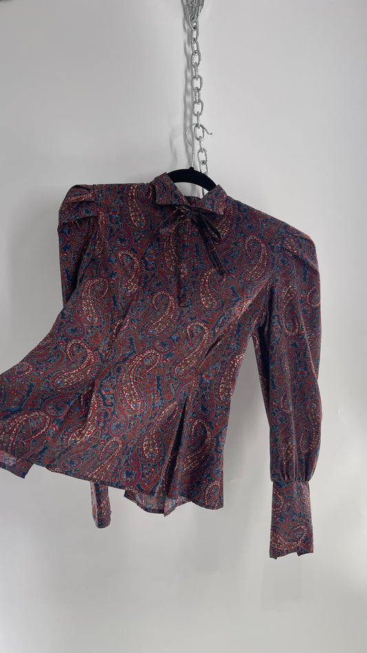 Vintage First Glance Paisley Balloon Sleeve, Sculpted Waist, Tie Neck Blouse from El Salvador (9/M)
