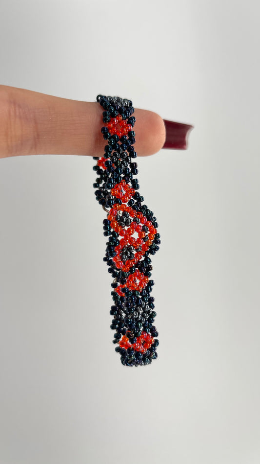 Vintage 70s Handmade Navy Beaded Bracelet with Red Heart and Flowers