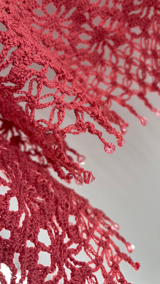 Vintage Hand Crochet Pink Shawl with Beaded Fringe Hem (One Size)