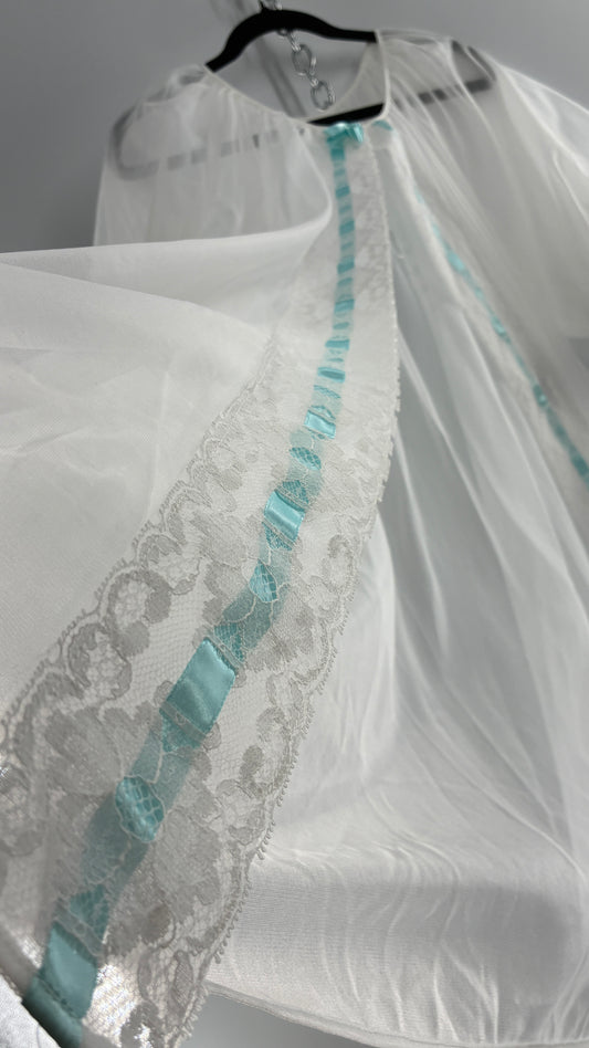 Vintage White Tulle Dress Cape with Oversized Puff Sleeves, Lined with Lace and Baby Blue Ribbon Trim (Medium)