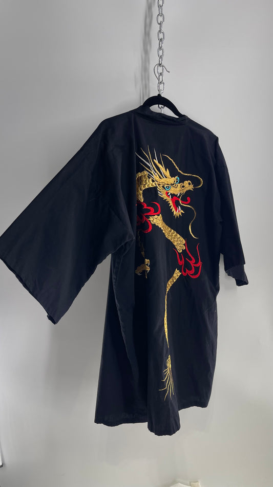 Vintage Japanese Cotton Cape/Kimono/Cardigan Robe with Hand Embroidered Gold Dragon (Small)