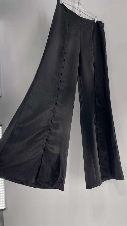 WHY Sultry Steps Black Satin Wide Leg Trouser with Vertical Strip of Satin Buttons (Medium)