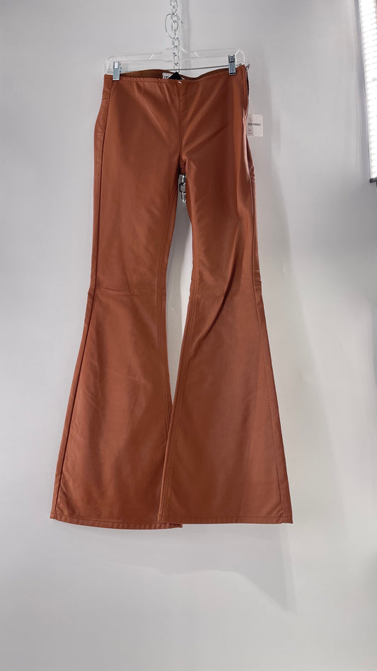 Vintage Toba&Co Tobacco Faux Leather Low Rise Zip Front Kick Flares with Wide Grommet Covered Bronze Circle Buckle Belt (S)