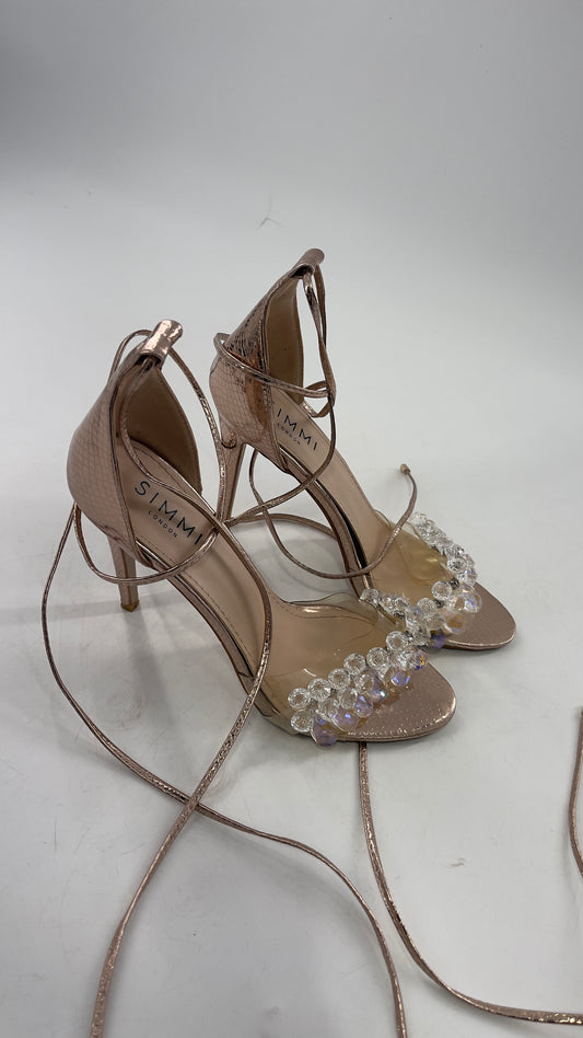 SIMMI LONDON Rose Gold Textured Heels with Clear Toe Strap Covered in Rhinestones/ Crystal Pendants and Tie Up Ankle Straps (7)