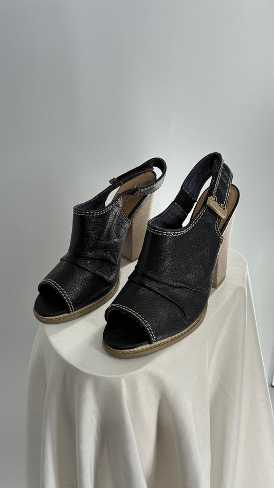 Calvin Klein Peep Toe, Ruched Black Leather Block Heel Slingbacks (7.5)