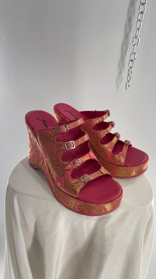 Free People Hot Pink Hoffman Buckle Front Wedge Heels with Satin Gold Paisley/Brocade Pattern (37)