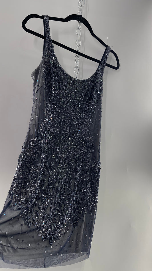 Vintage Cache Moonlight Grey/Navy Blue Tunic Mini Dress with Accentuating Placement of Beads, Sequins and Embroidery Details (2)