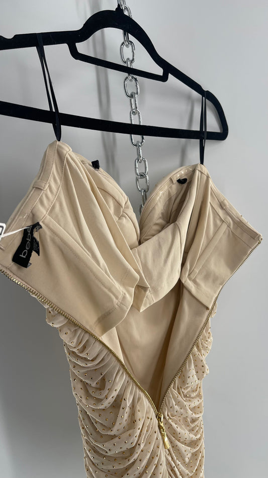 Vintage BEBE Beige Gold Studded, Ruched Mini Dress with Built In Corset (XXS)