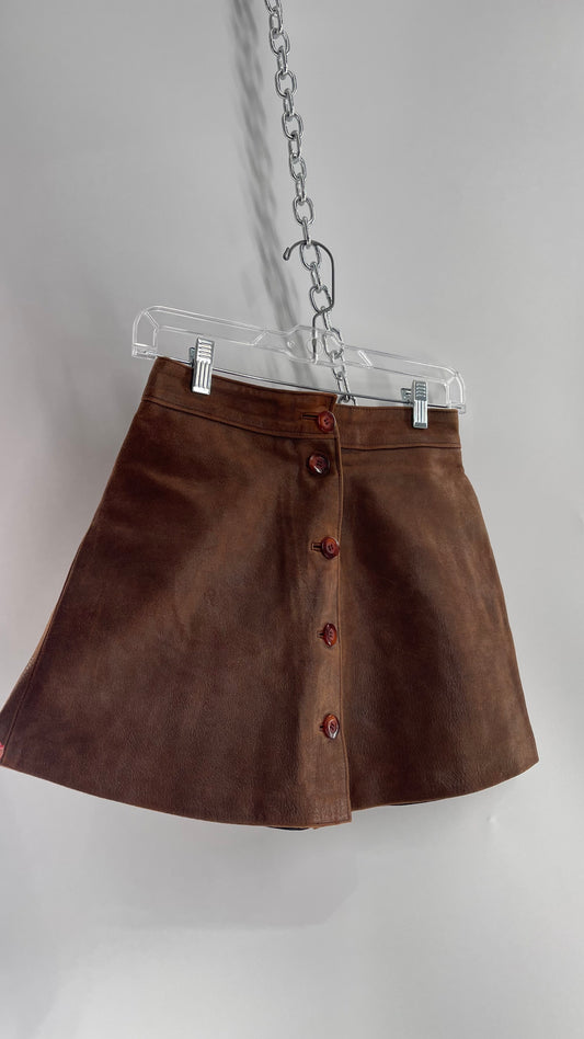 Vintage 1970s Brown Leather Button Front Mini Skirt (XS)
