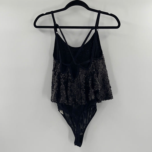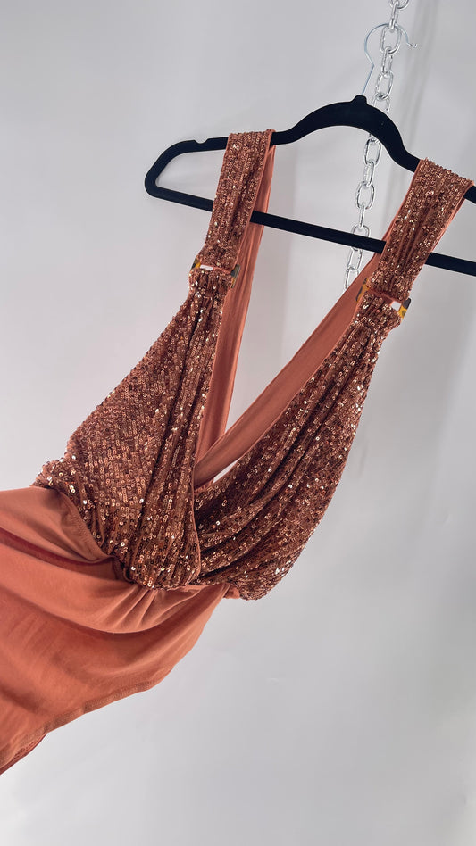 Free People Copper Sequin Draping Bodysuit with Tortoise Shell Buckle Detail (Medium)
