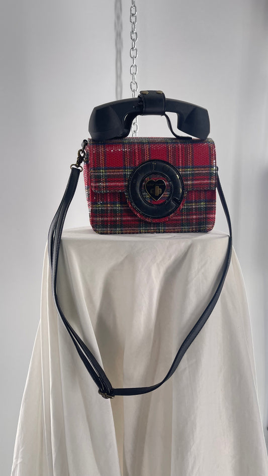 Rare Deadstock Vintage Betsy Johnson Red Plaid Telephone Sequin Bag with Wiring to connect to Phone