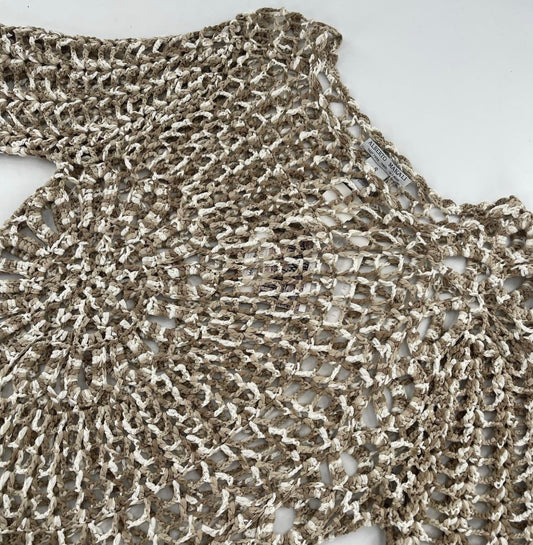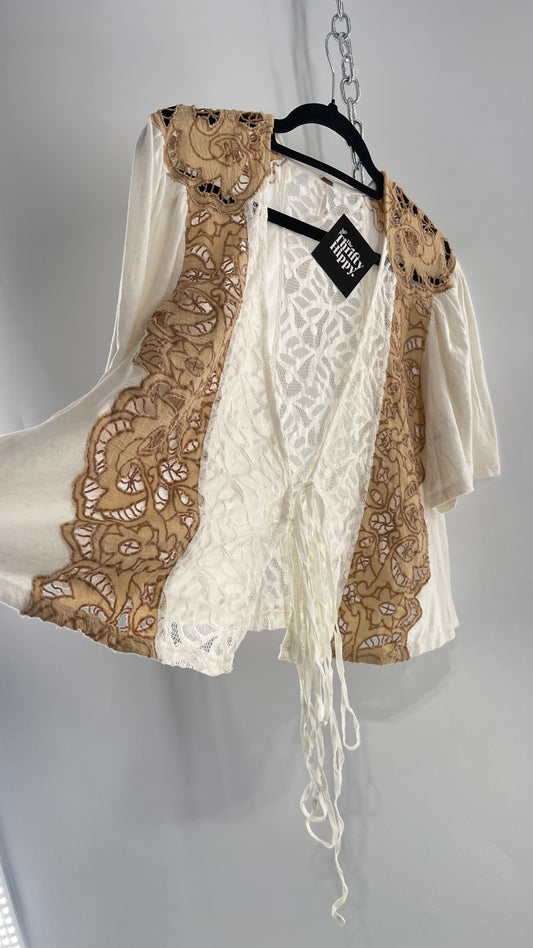 Free People Off White Woven Tie Front/Tie Around Too with Brown Eyelet Lace (Small)