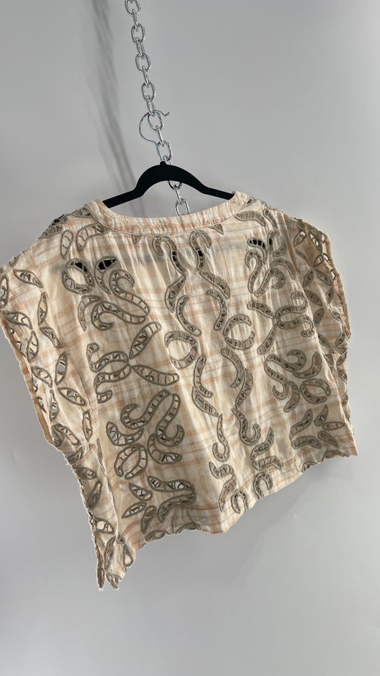 Free People 100% Cotton Plaid Blouse with Tan Embroidered Eyelet Lace Cut Outs (XS)