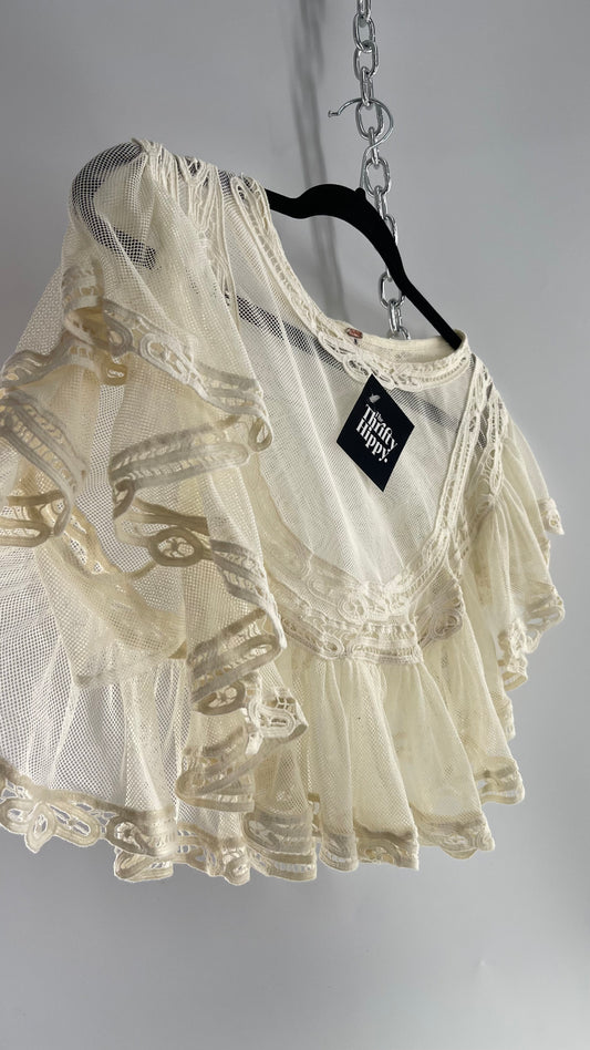 Free People Off White Mesh Lace Trim Bib/Collar Cropped Blouse (Small)