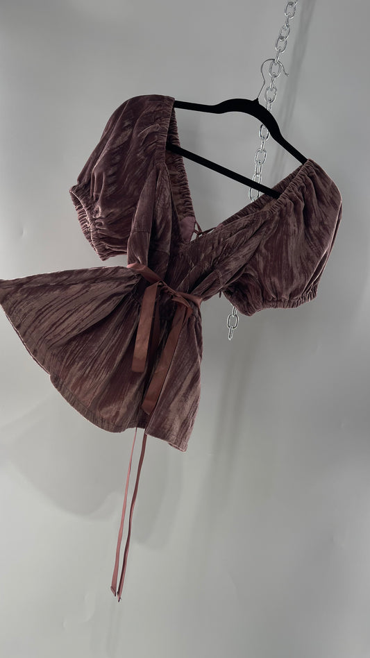 Porridge Dusty Purple Velvet Puff Sleeve Corset-esque Tie Up Back Peplum Blouse with Bust Stitching (Medium)
