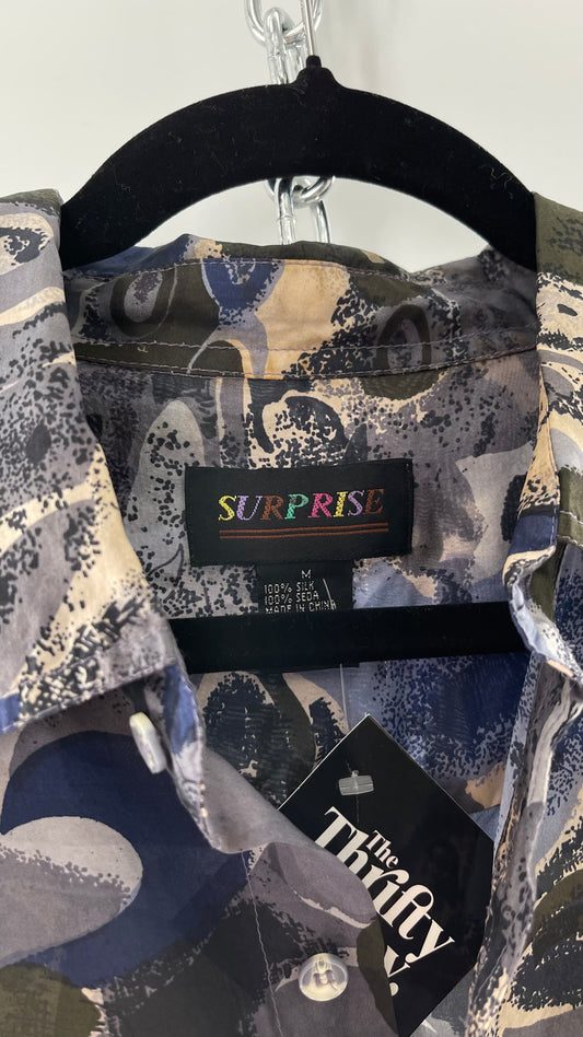 Vintage SURPRISE 100% Silk Blue Green Patterned Short Sleeve Button Up (Medium)