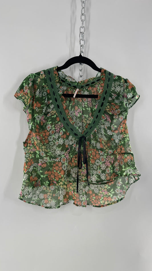 Free People Green Floral Blouse with Green Lace Neckline and Black Velvet Ribbon (Large)