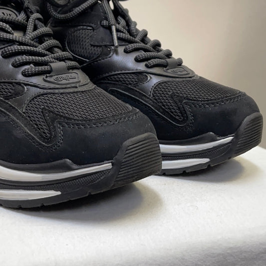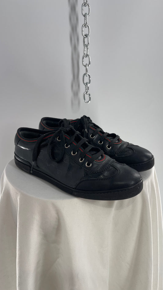 Vintage GUCCI Worn Black Leather Monogram Low Top Sneakers with Red/Green Iconic Trim (37)