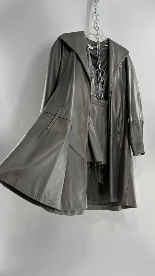 Vintage 1980s JUST PIERRE 3pc Metallic Silver Leather Trench Coat, Micro Mini Skirt and Sheer Blouse Set (S/M)