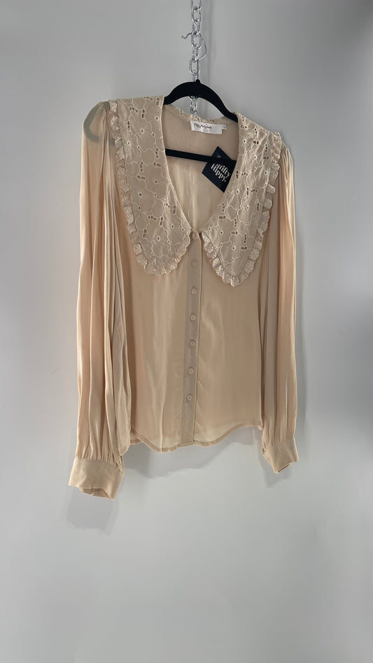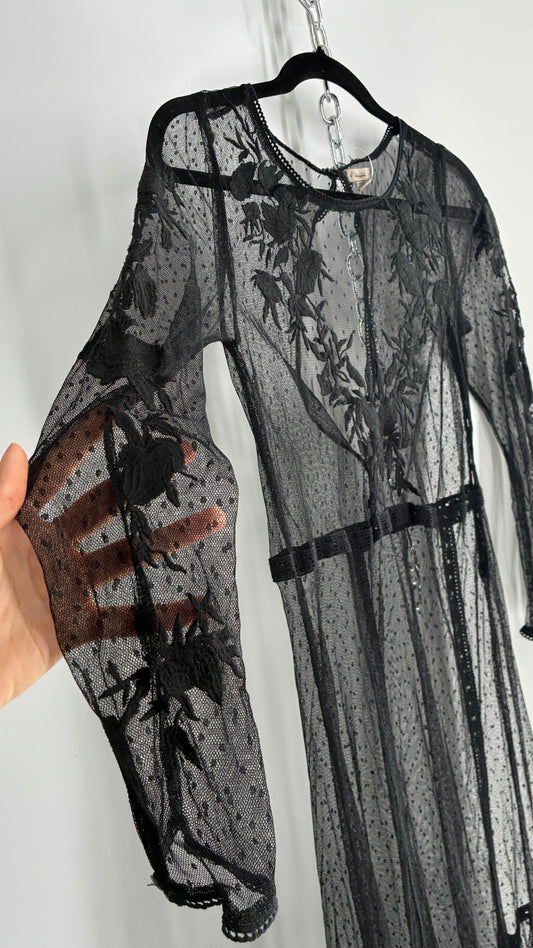 ECOTE Sheer Mesh Full Length Dress with Lace AppliquƩ Sleeves and Bust (Medium)