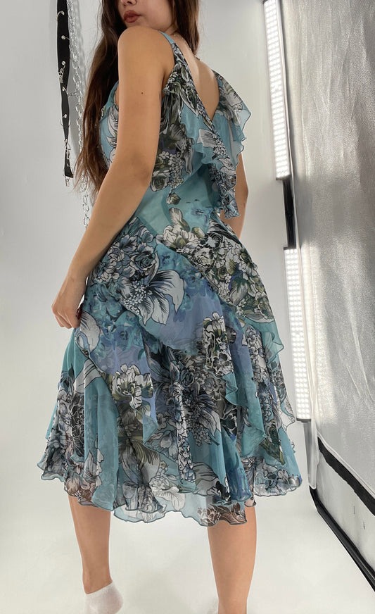 PromoçãoVintage 1990s Blue Floral Ruffle Dress (M)