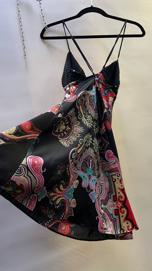 Vintage Rubber Ducky Satin Paisley Patterned Slip Dress with Black Sequin Bust (Medium)