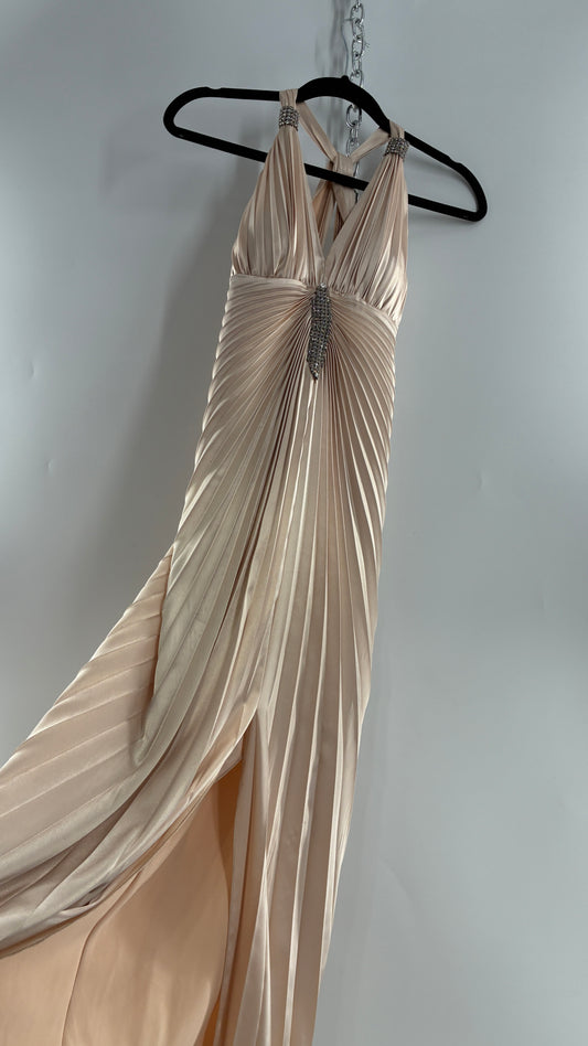Vintage ISSUE Pleated Champagne Gown with Vented Slit Front, Crystal Bust AppliquƩ and Strap Cuffs (2)