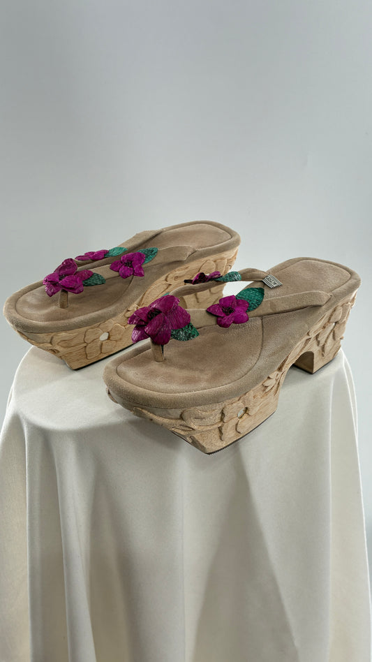 RARE Vintage VALERIA LACERDA Wooden Platform Sandal with Engraved Florals, Fuchsia Flowers and Mirror Details (7)
