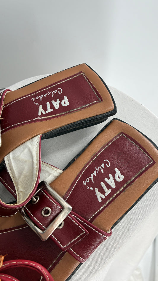 Vintage Burgundy Leather, Square Toe, Made in Brazil Sandals with Metal Buckle Strap (36)