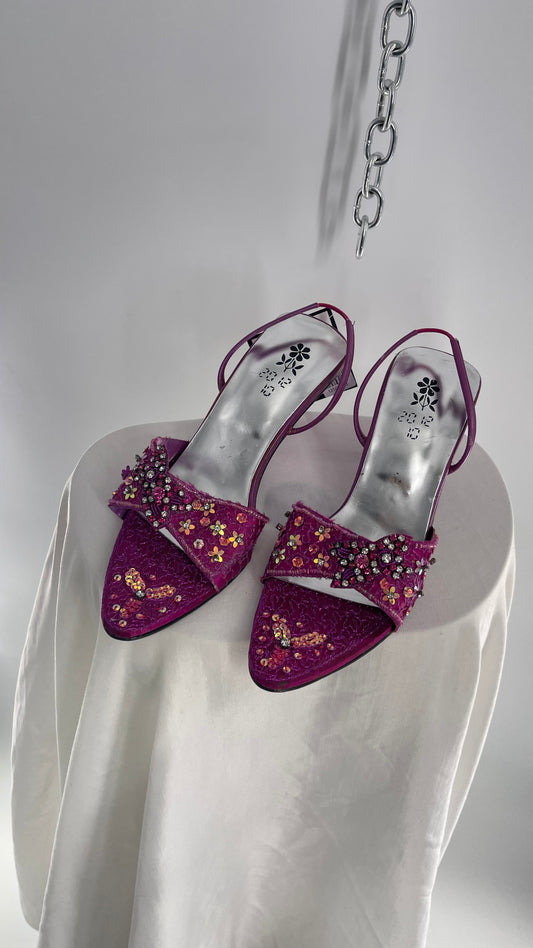 Vintage 20:12:10 Fuchsia Beaded Satin Pointed Toe Slingback Heels (7.5)