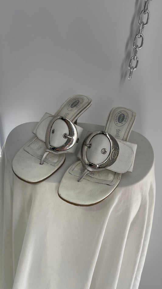 Vintage Rare 1990s Dr.Scholls White Leather Thong Kitten Sandal with Wide, Exaggerated Buckle Detail (7)
