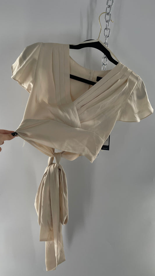 BCBGMAXAZRIA Off White Ivory Satin Tie Around Waist Cropped Blouse with Button Back and Tags Attached (XXS)