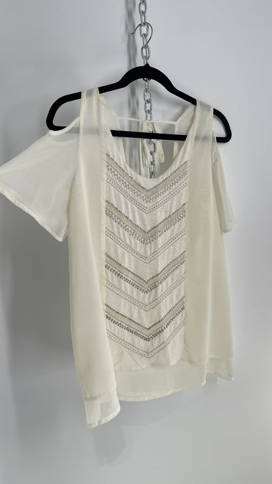 BKE White Cold Shoulder Short Sleeve Blouse with Beaded Panel (Medium)