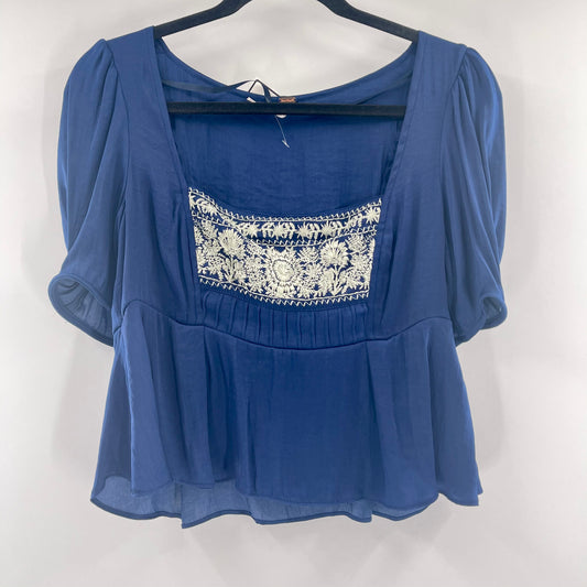 Free People Navy, Silky Embroidered Short Sleeve (XS)