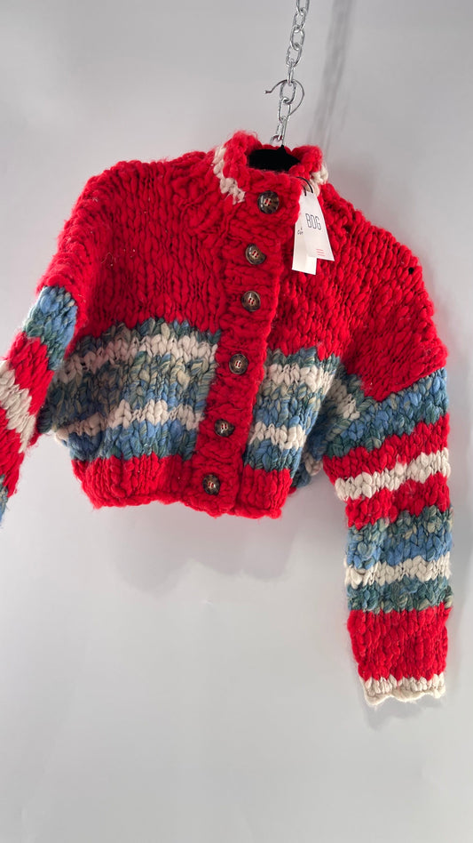 BDG Urban Outfitters Thick Knit Red White Blue Chunky Cropped Striped Cardigan (XS)