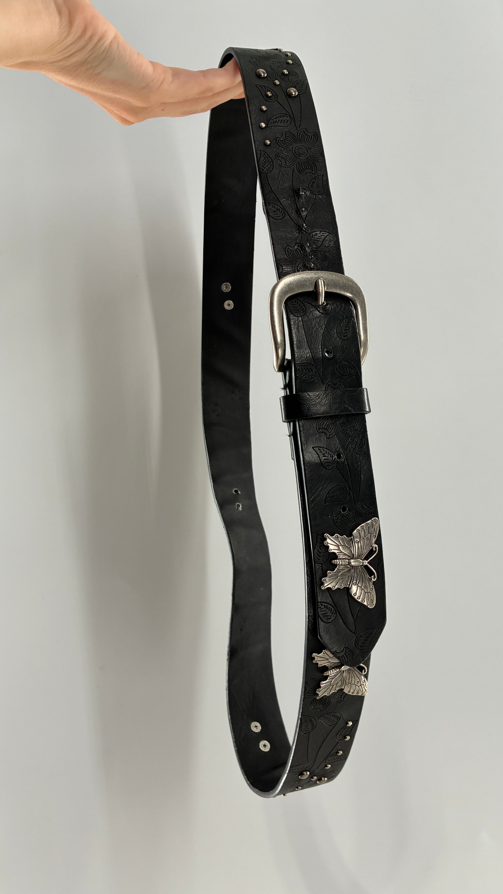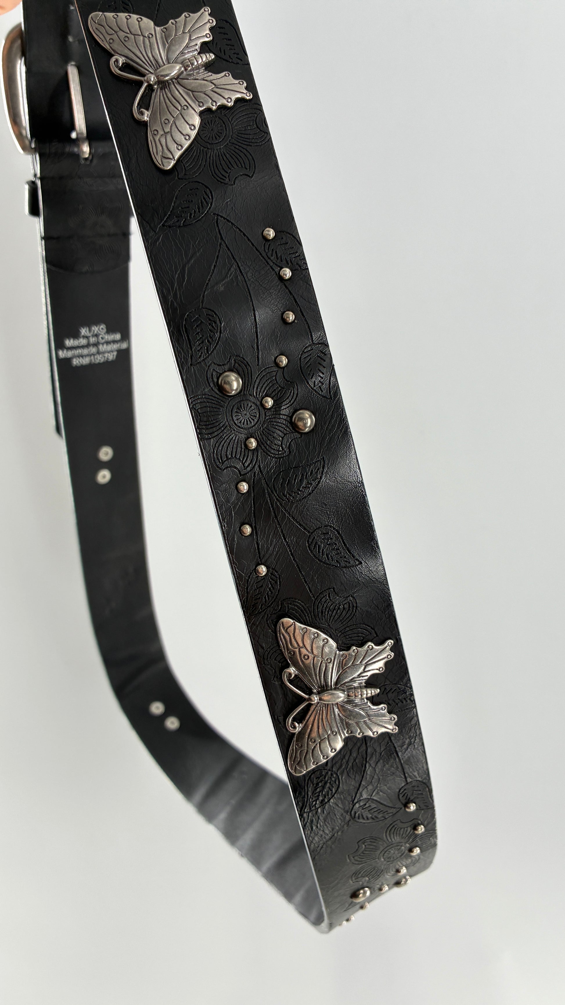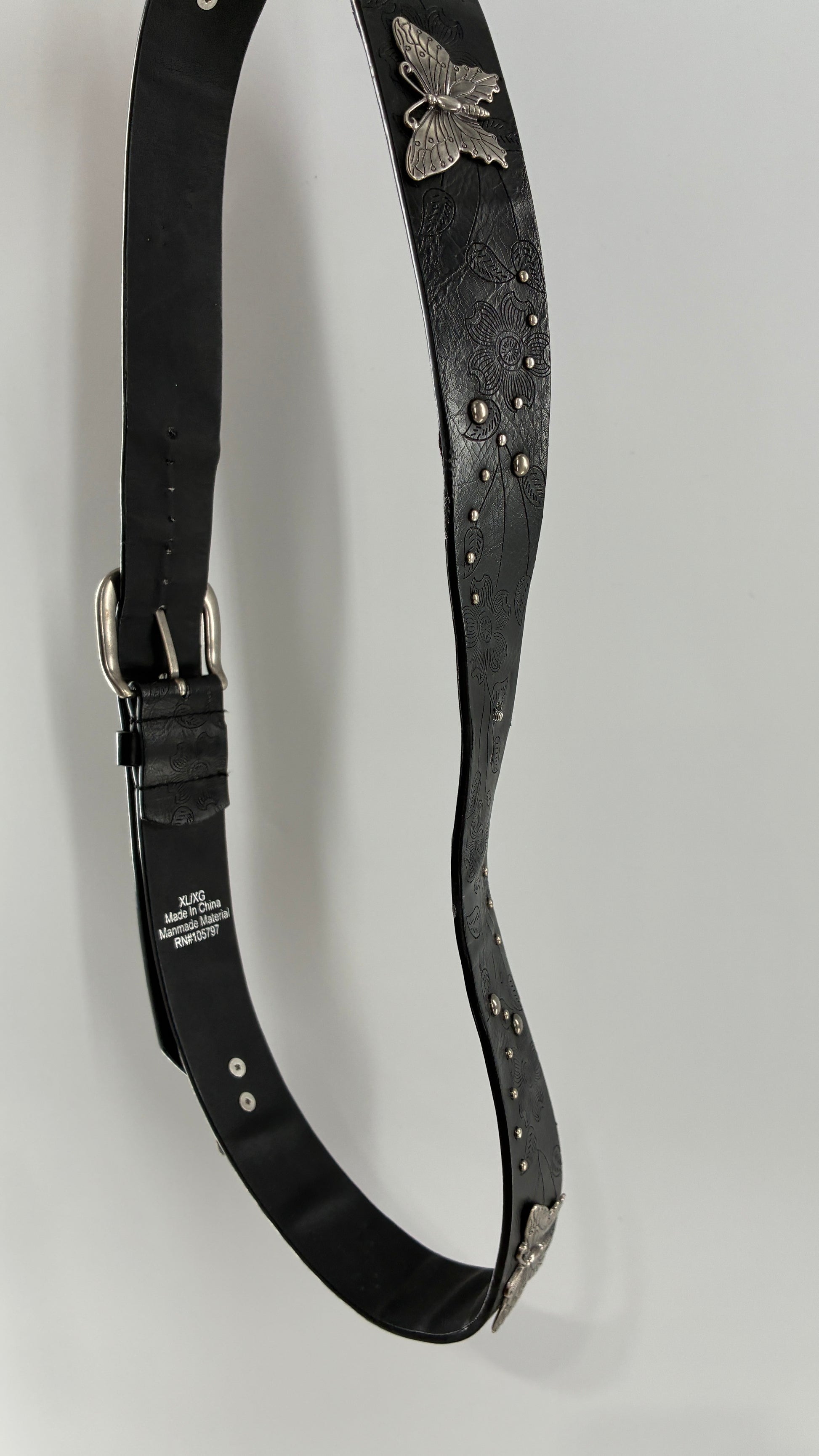 Vintage Distressed Black Embossed Belt with Silver Metal Butterfly Medallions (XL)