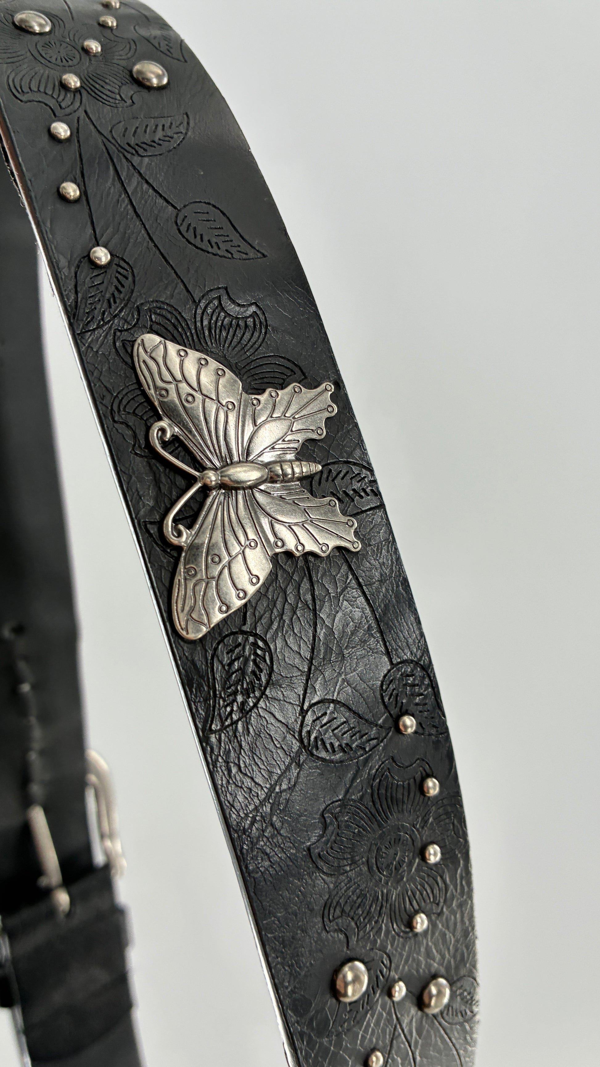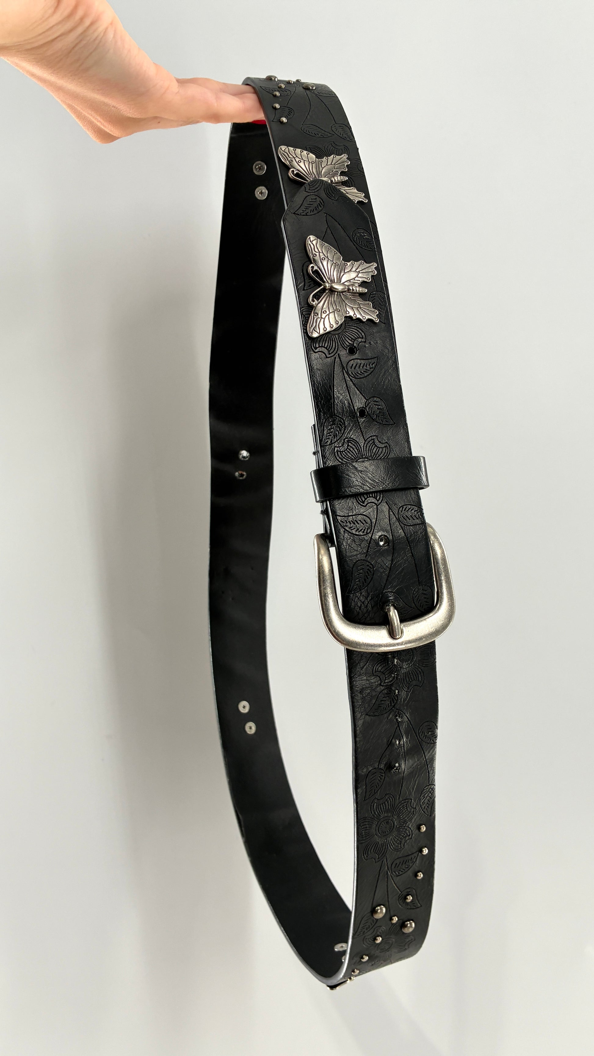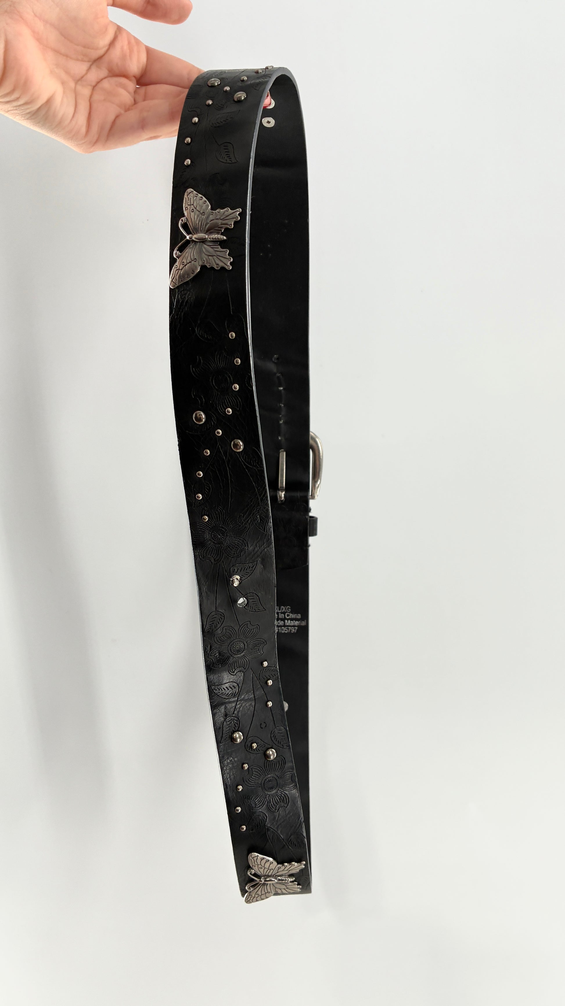 Vintage Distressed Black Embossed Belt with Silver Metal Butterfly Medallions (XL)