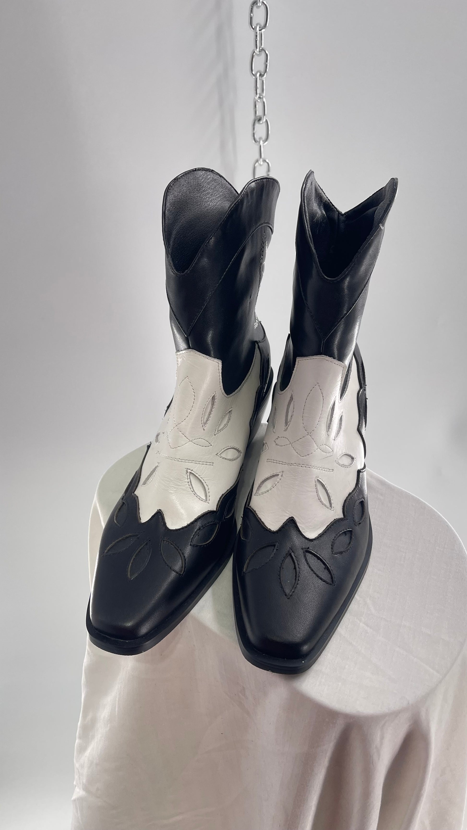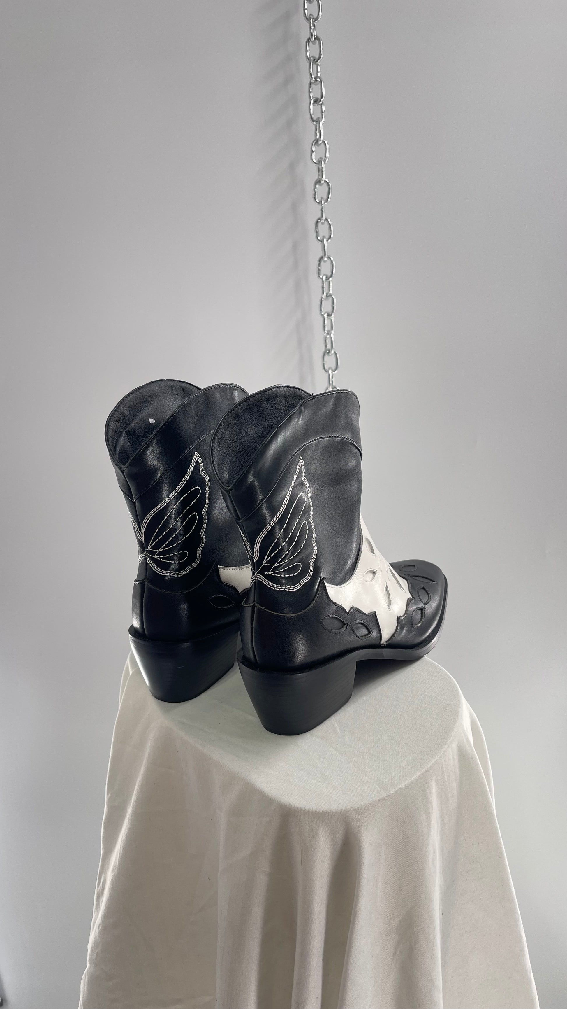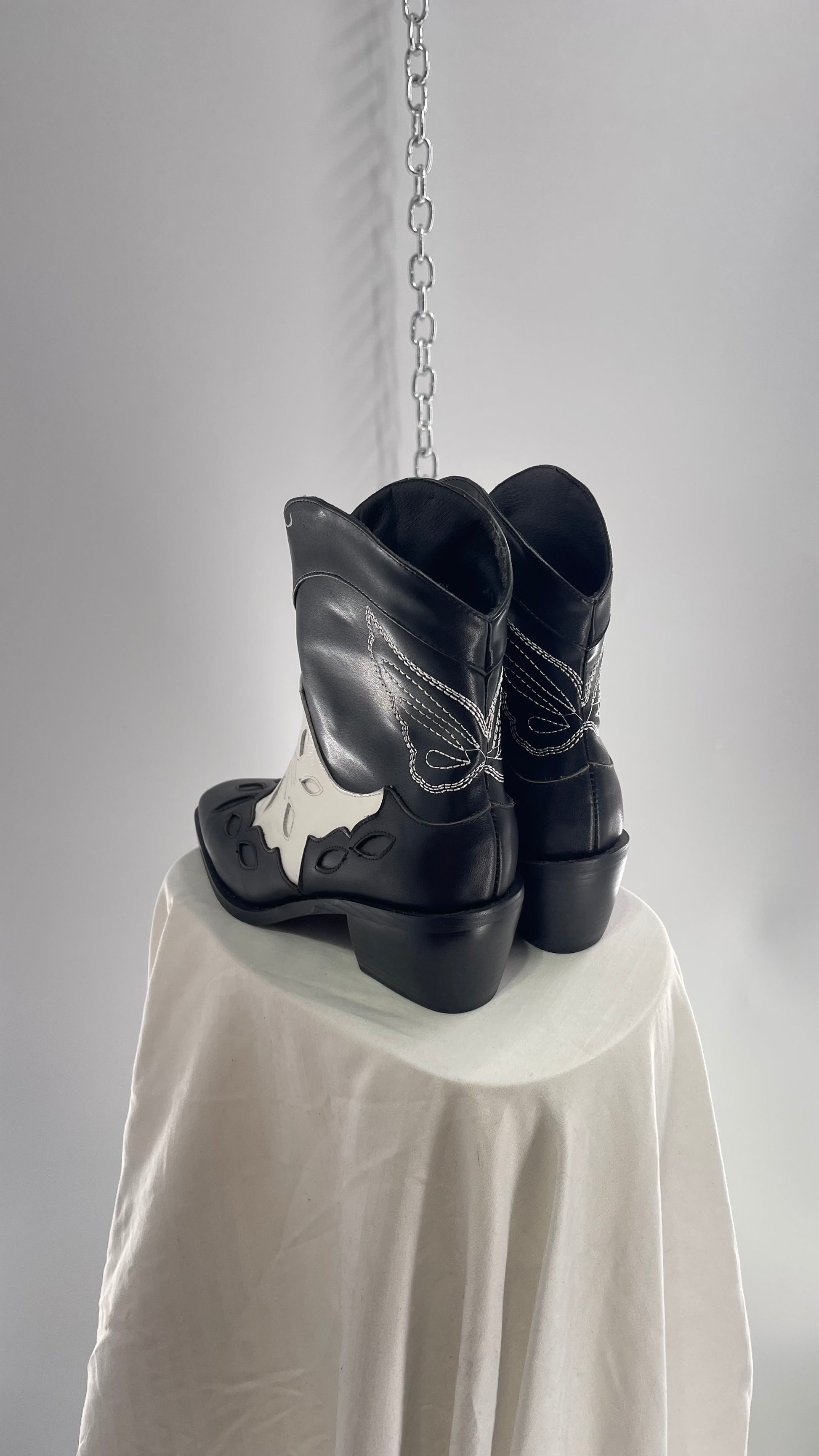 Black and White Cowboy Boots with Embroidered Butterfly Wings on Back (40)