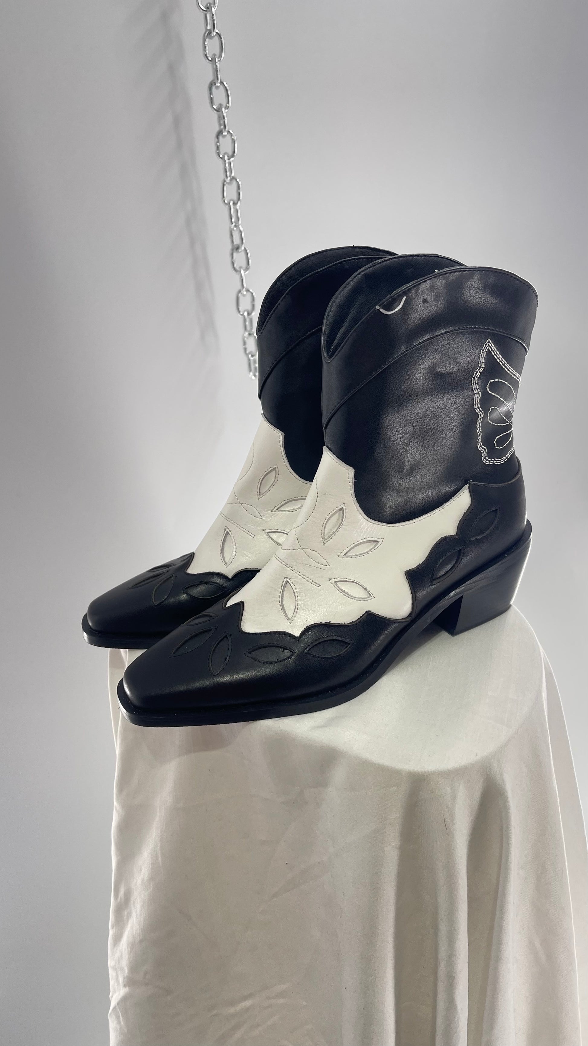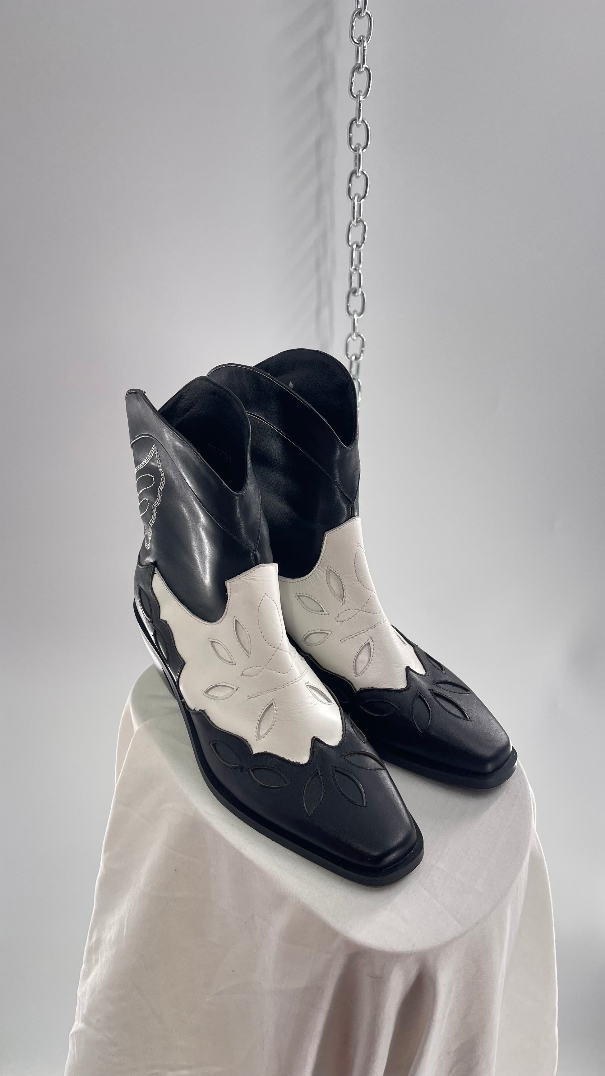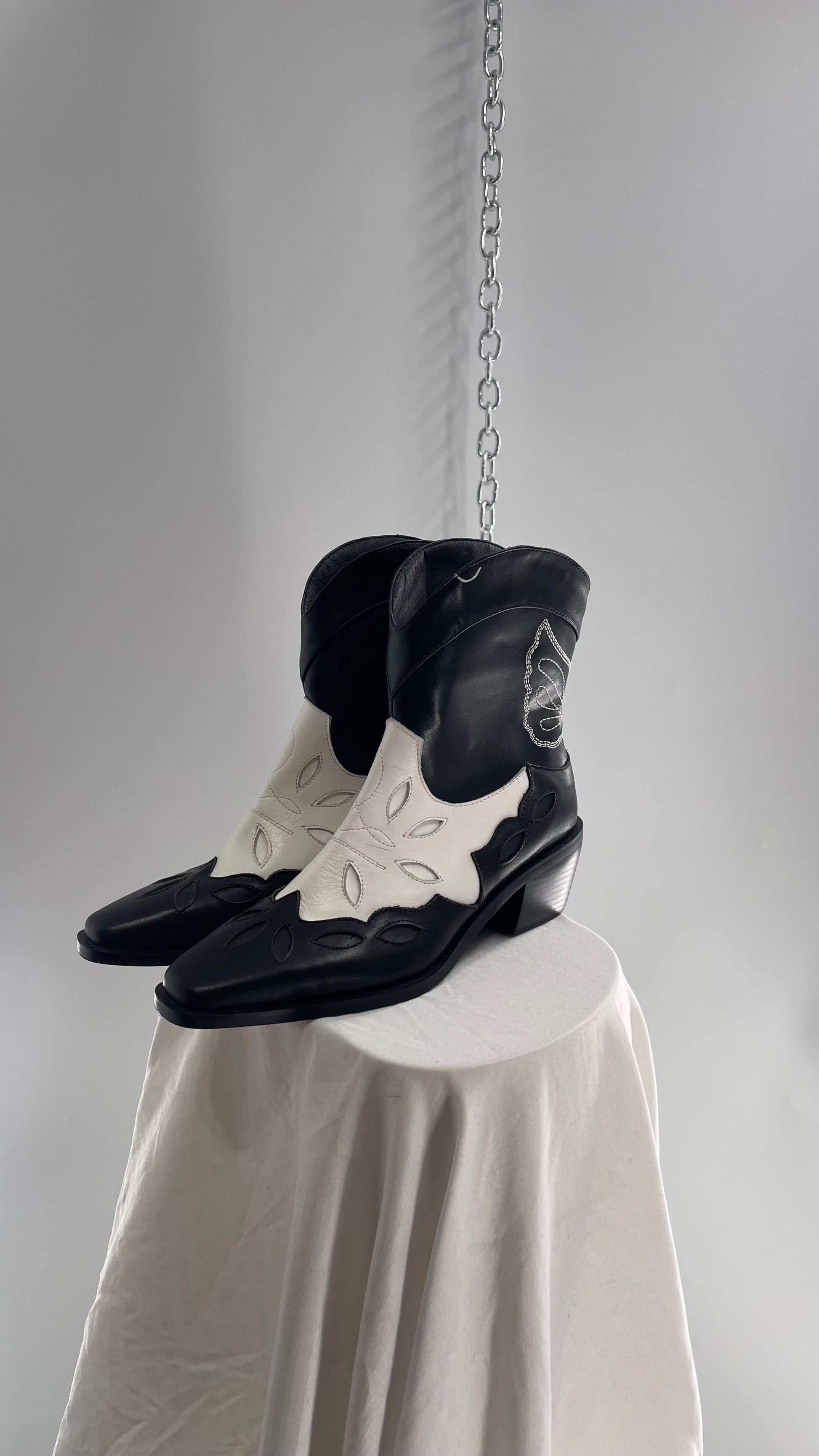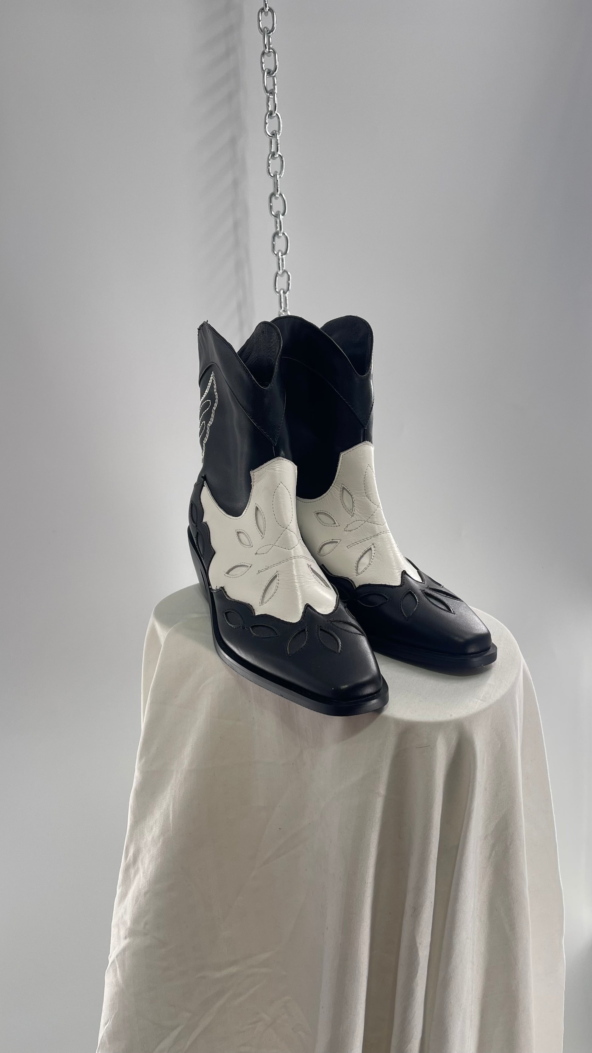 Black and White Cowboy Boots with Embroidered Butterfly Wings on Back (40)