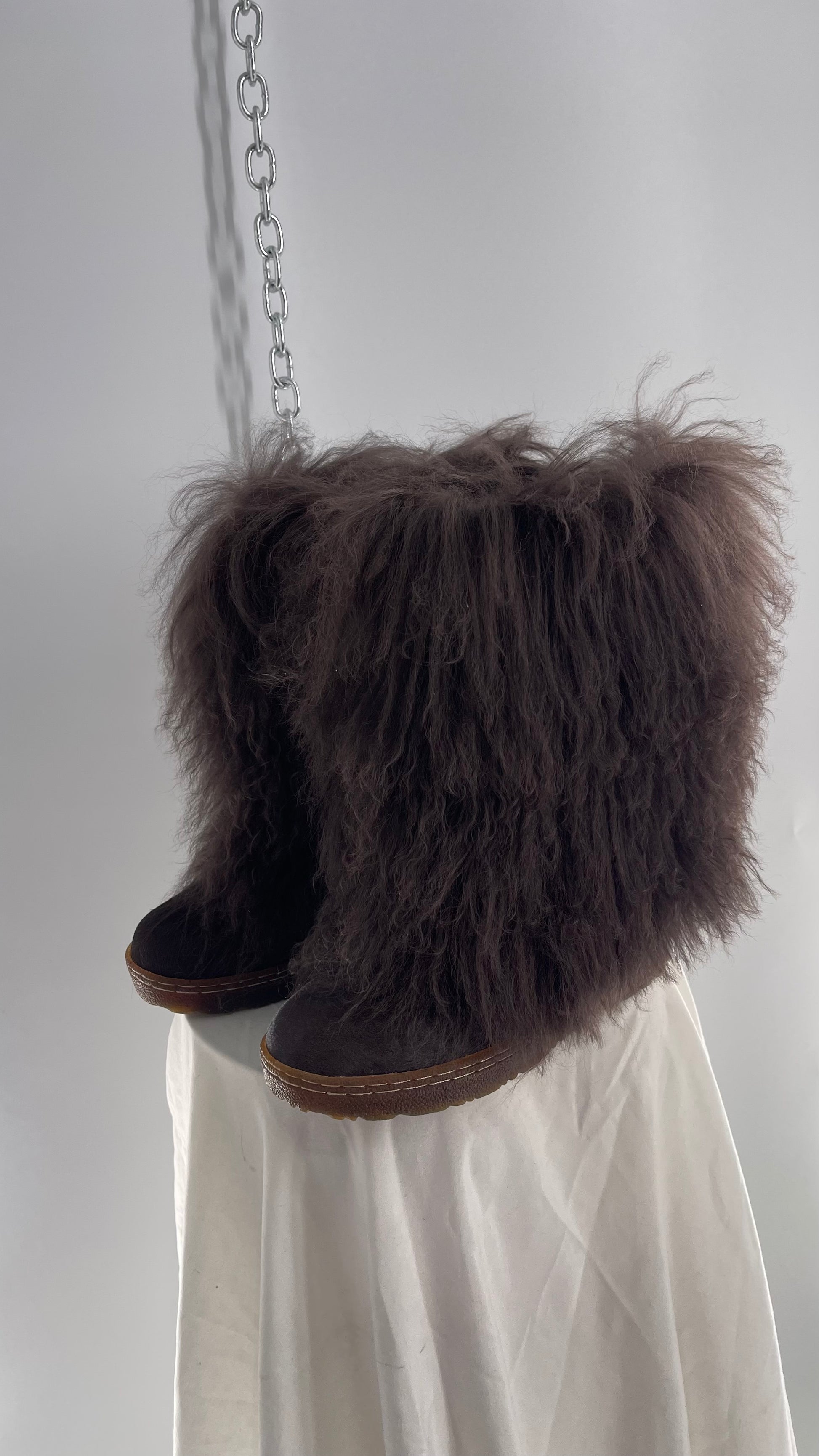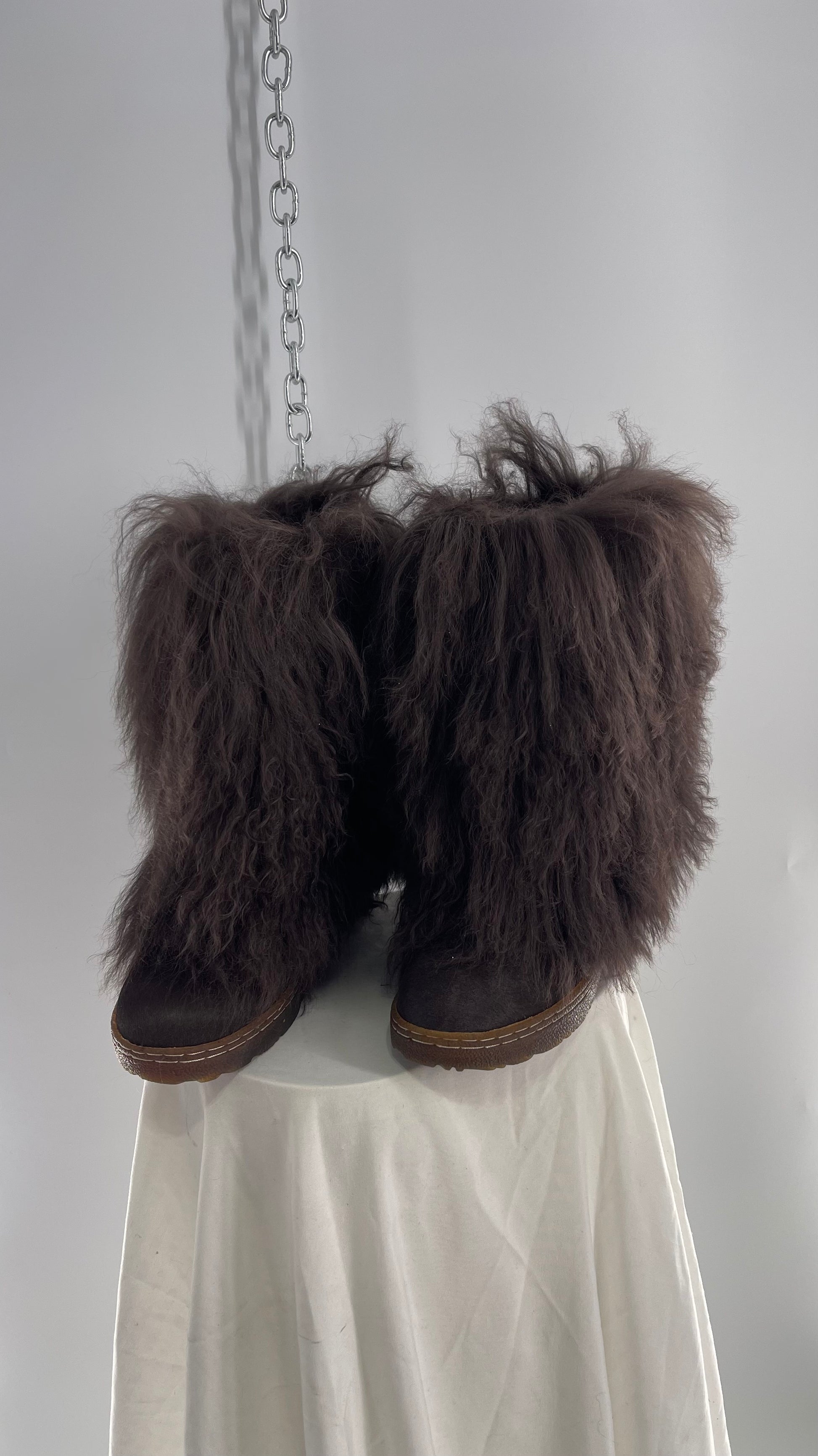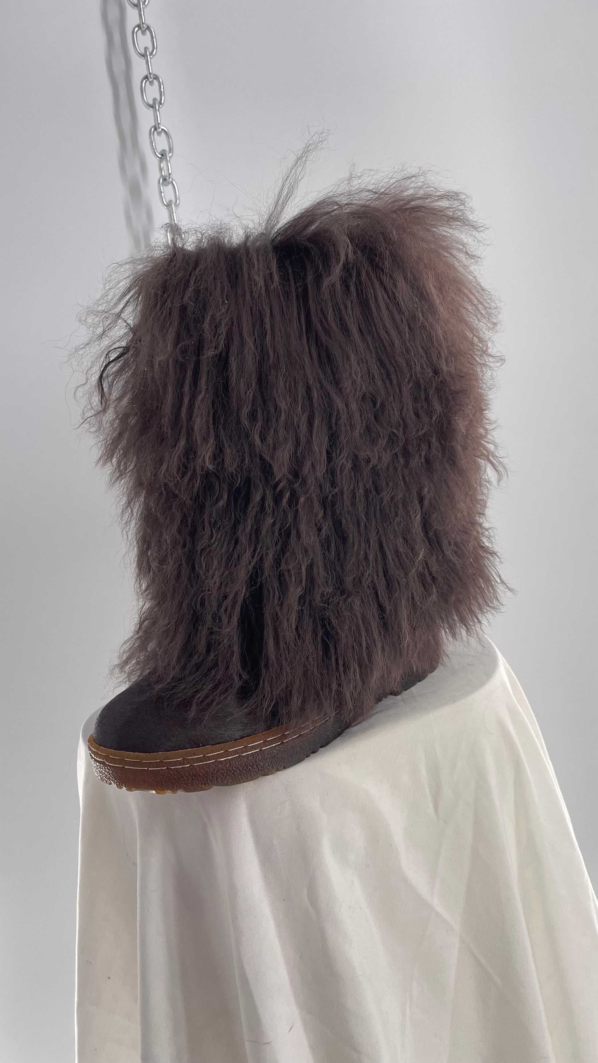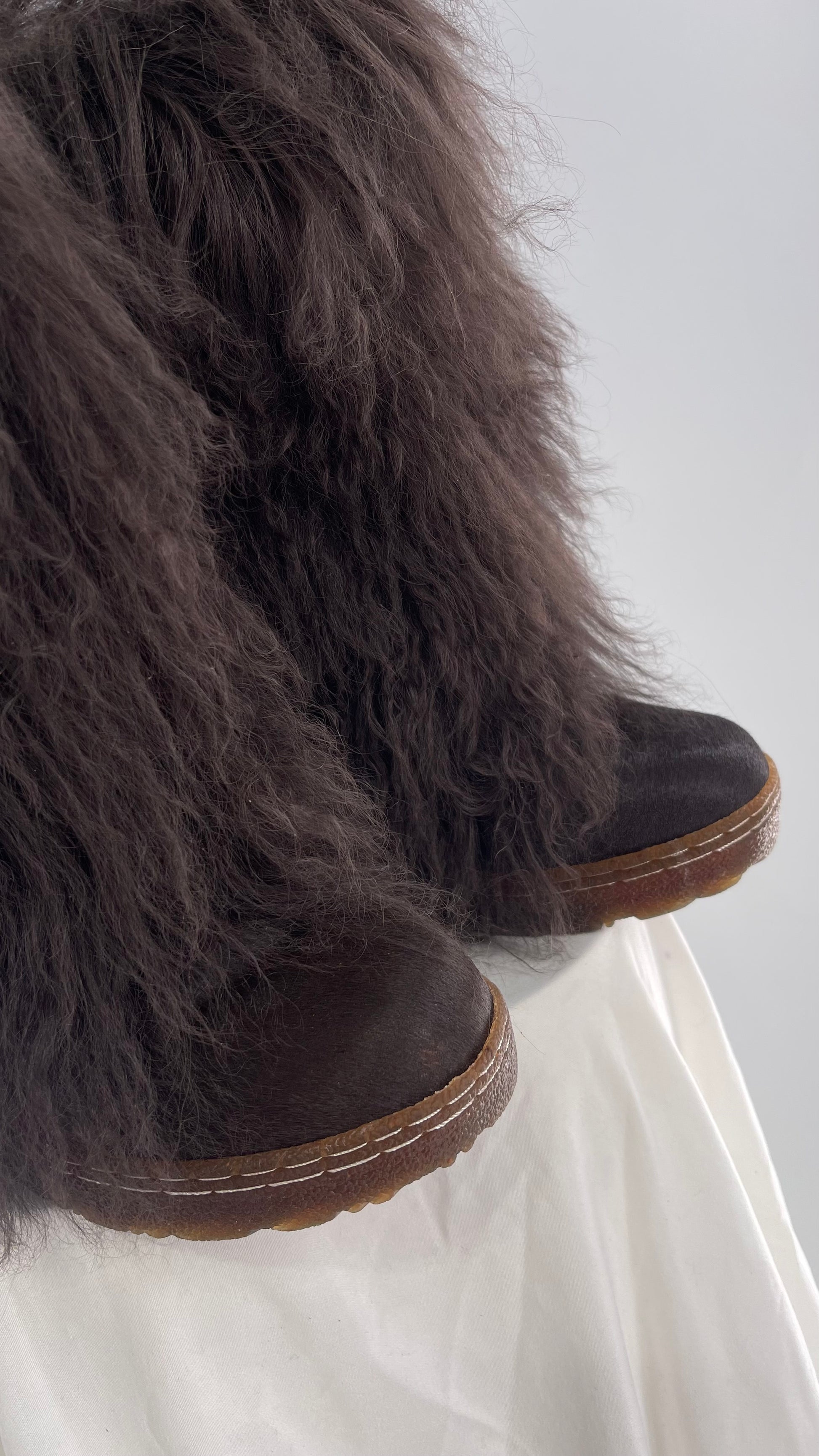 Vintage BEARPAW Boetis Chocolate Cow Hair and Curly Lamb Fur Exaggerated Fuzzy Boots (7)