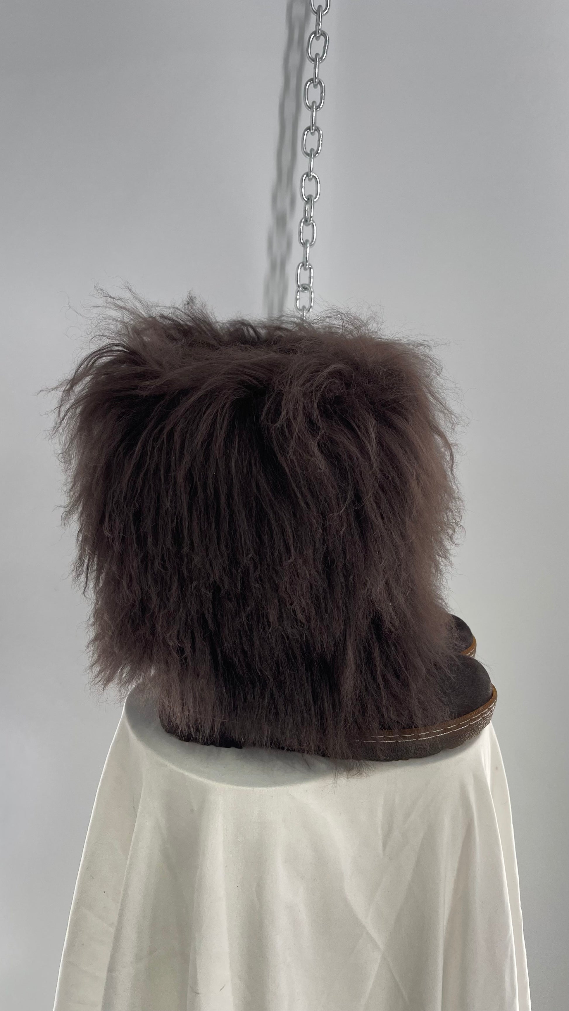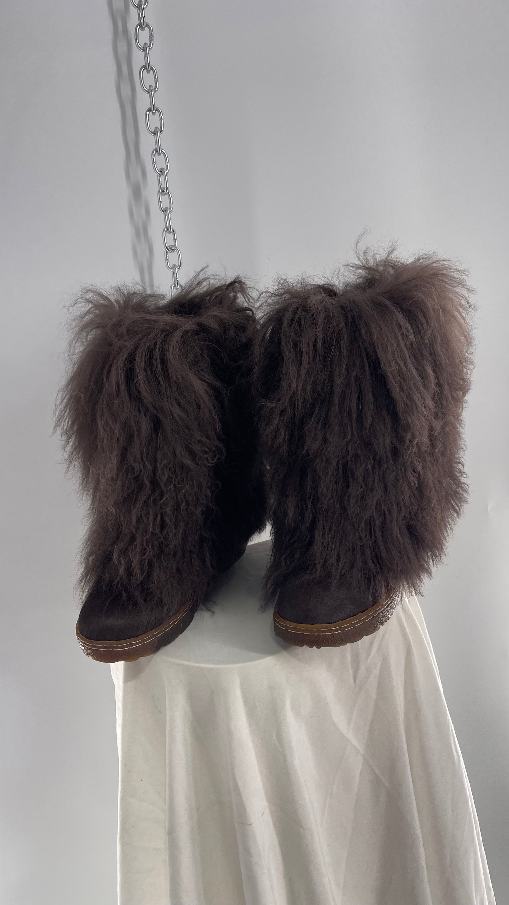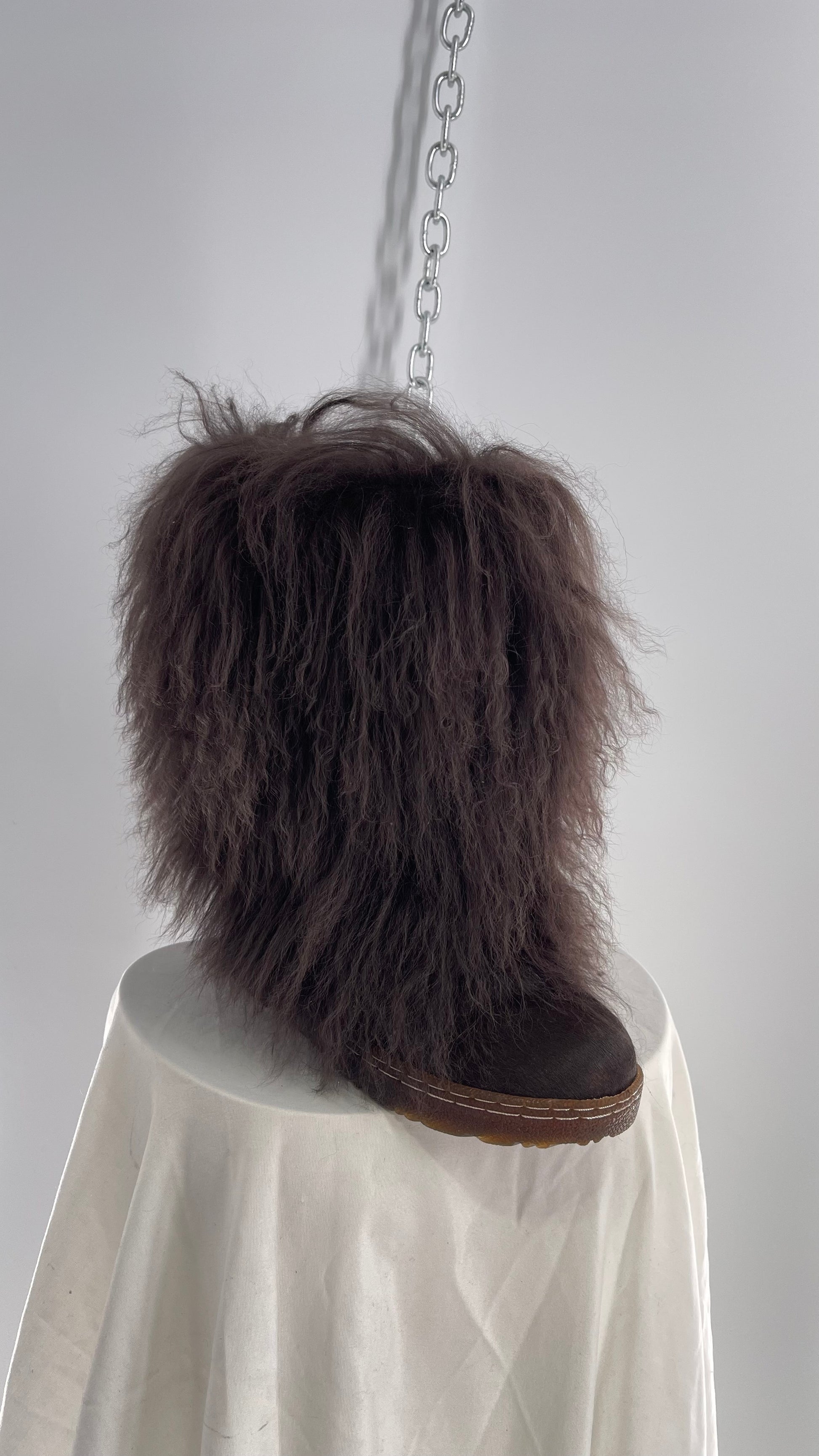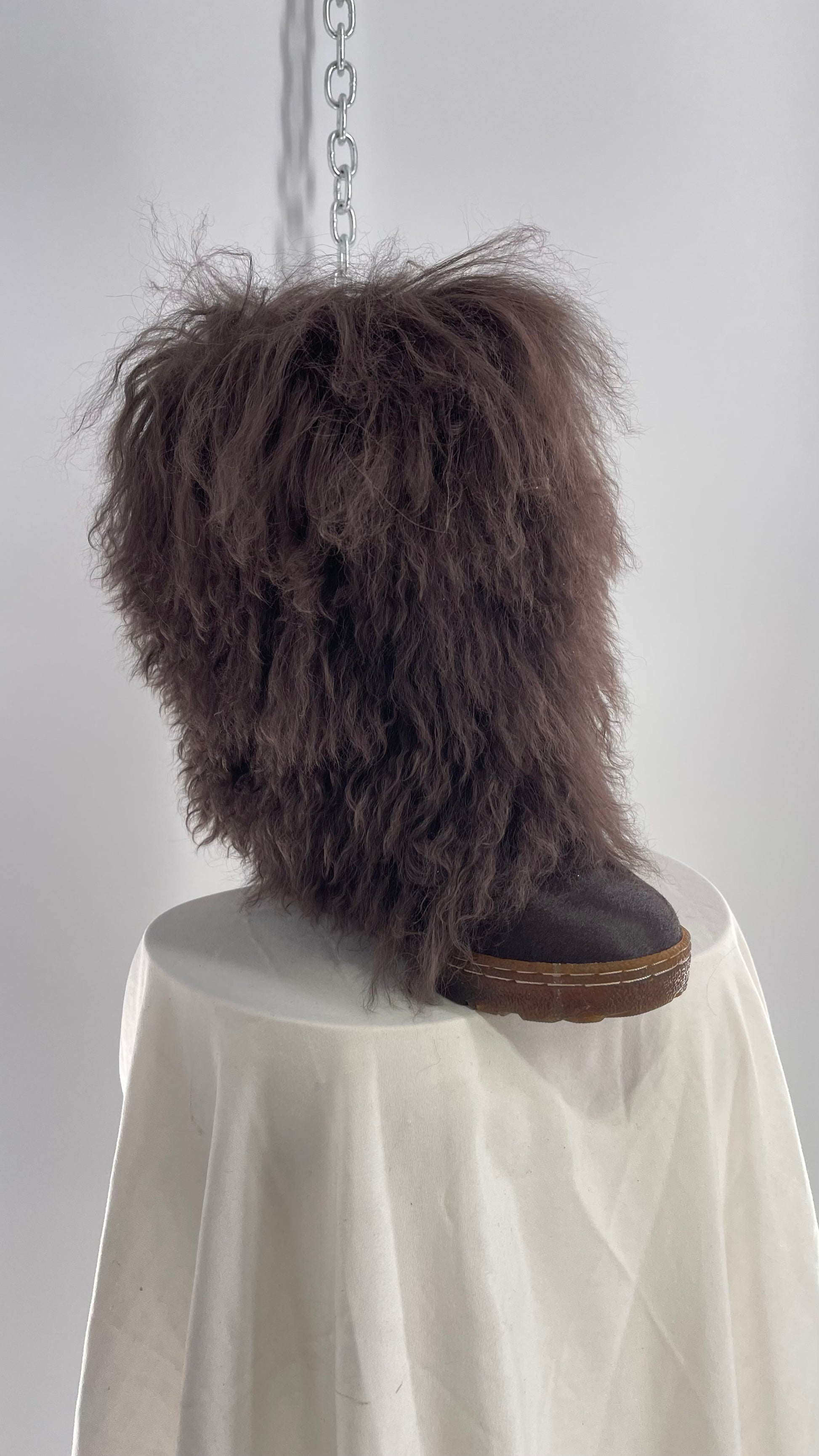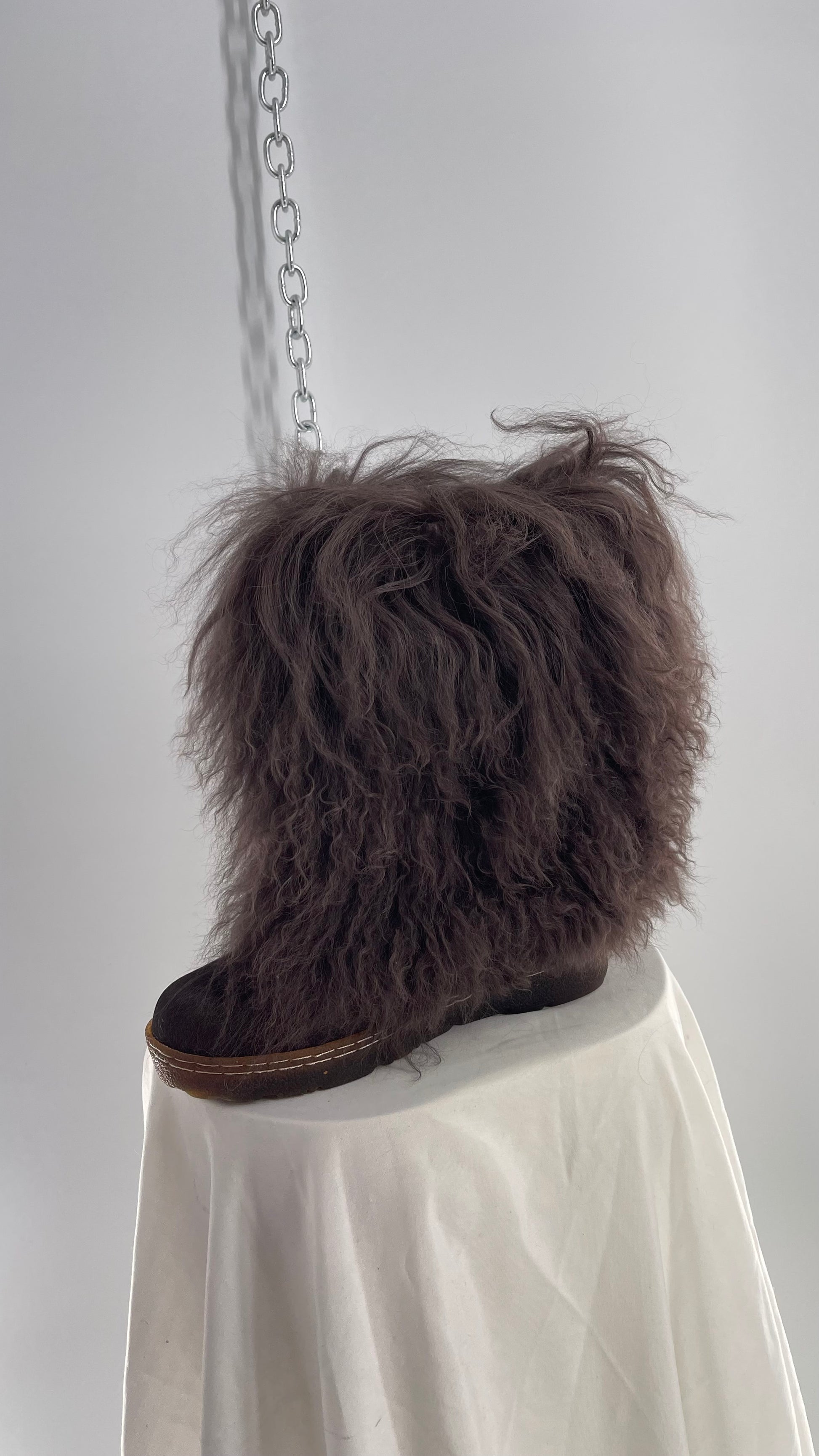 Vintage BEARPAW Boetis Chocolate Cow Hair and Curly Lamb Fur Exaggerated Fuzzy Boots (7)