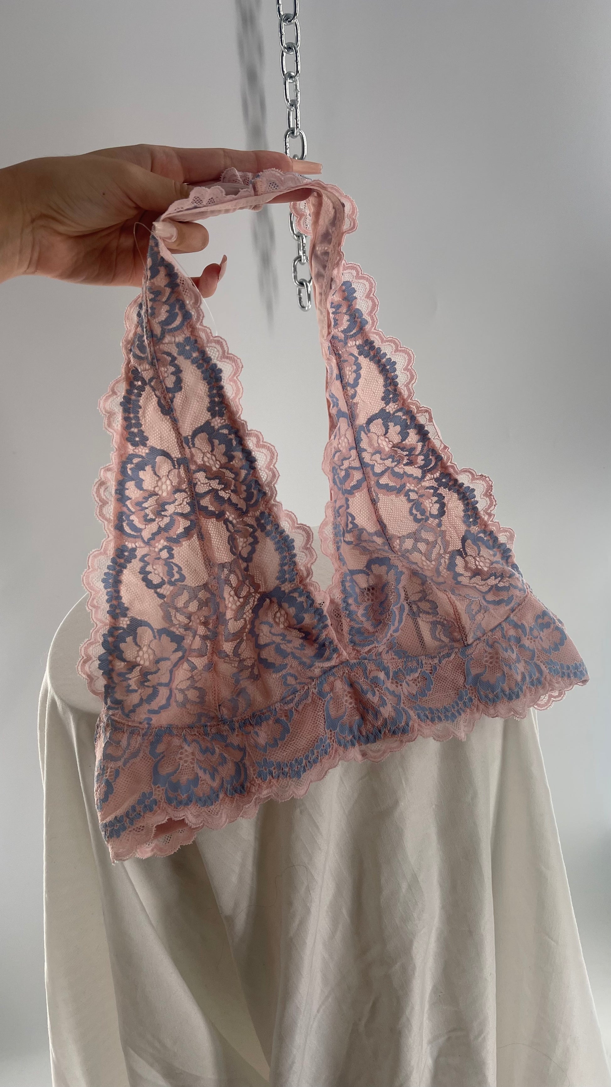 Pink and Powder Blue Delicate Lace Halter Bralette (Medium)