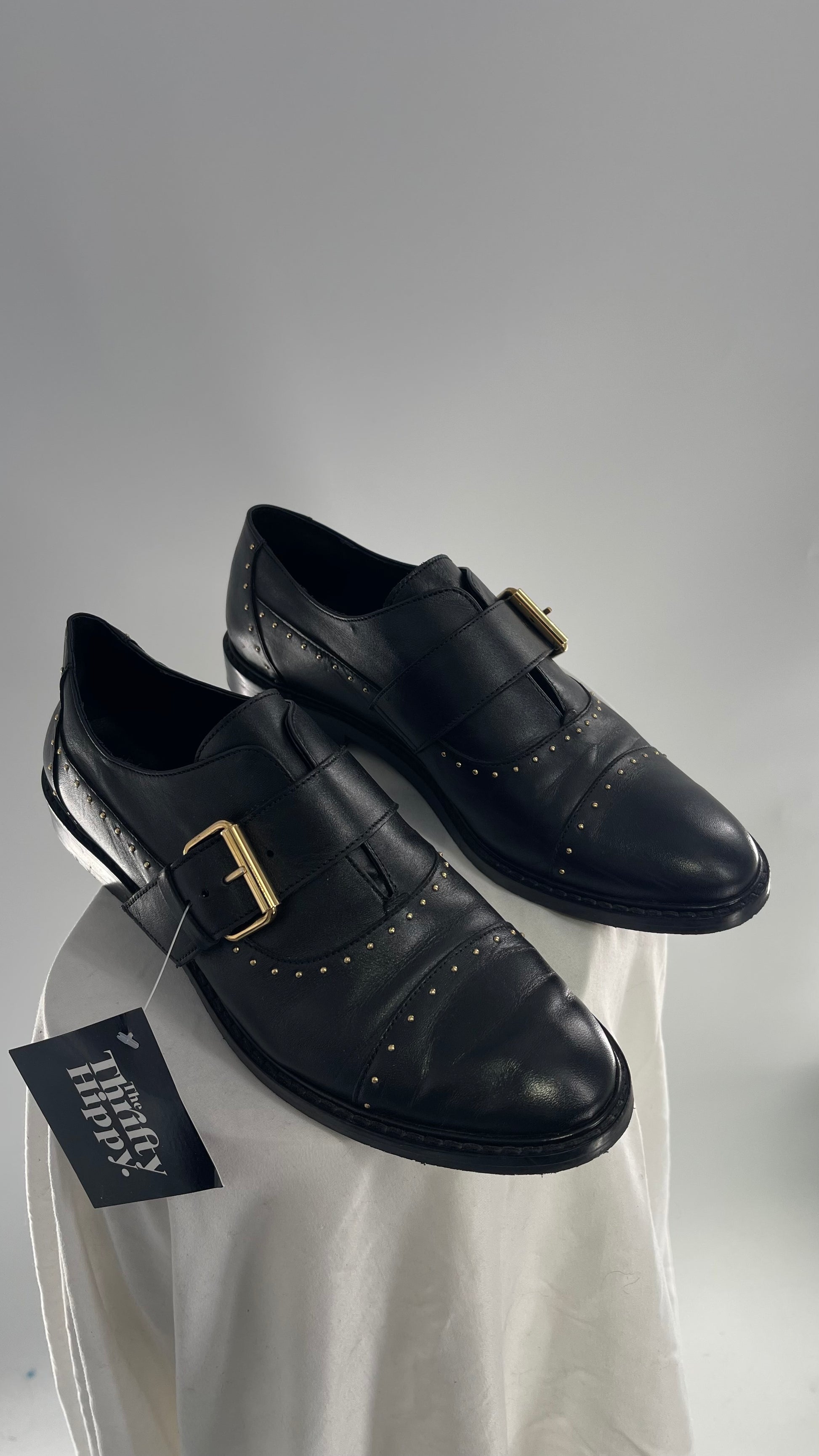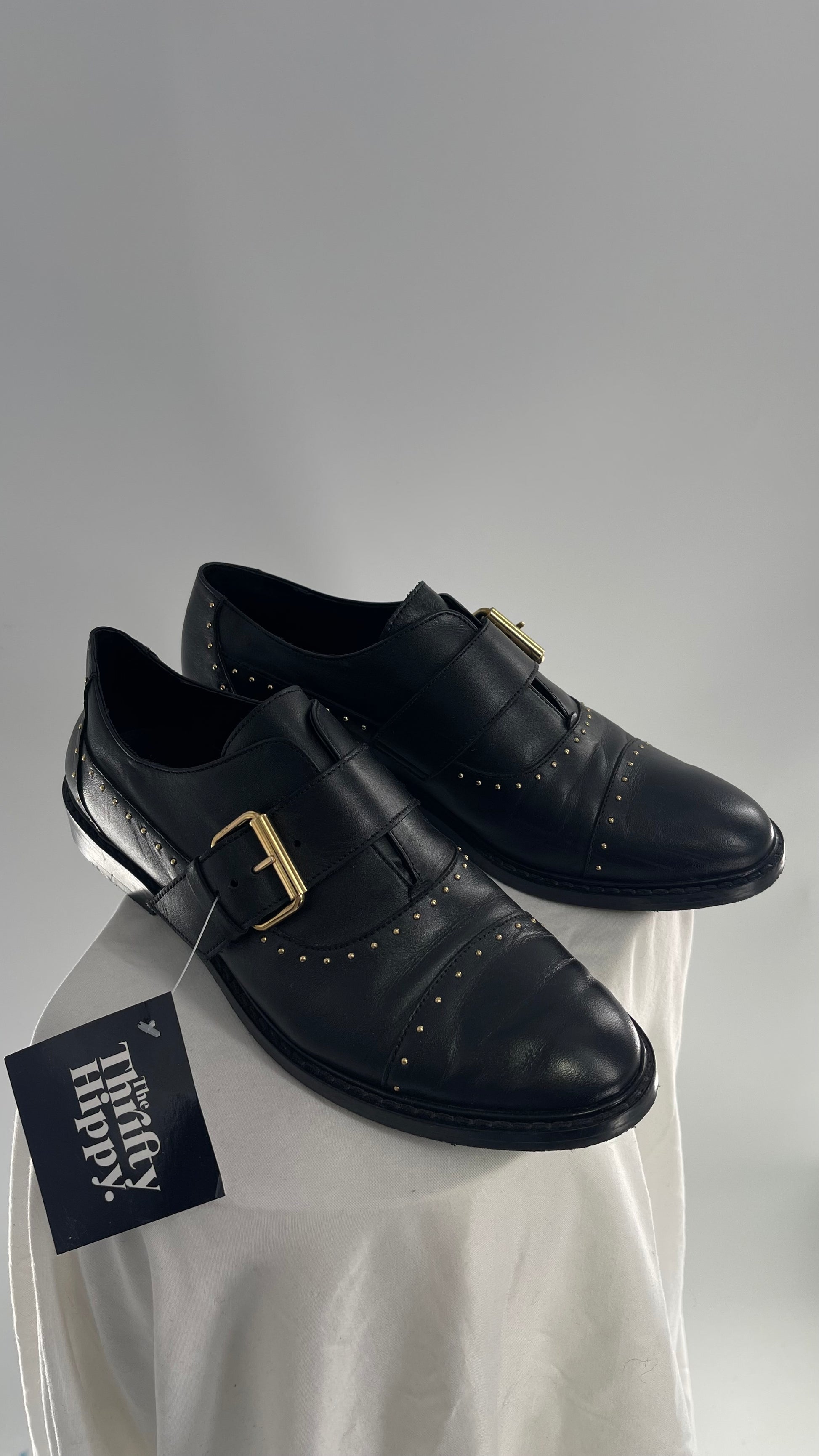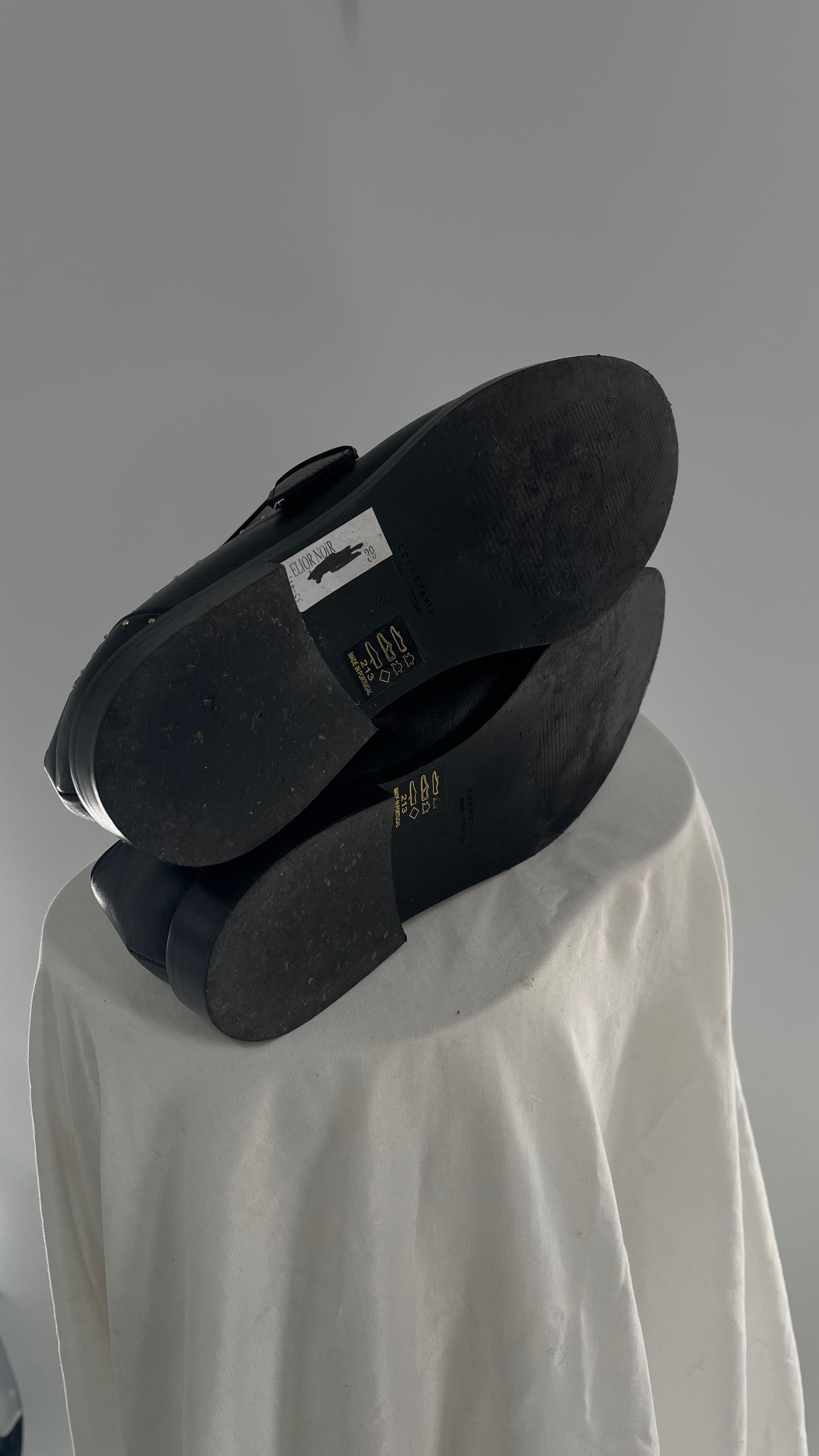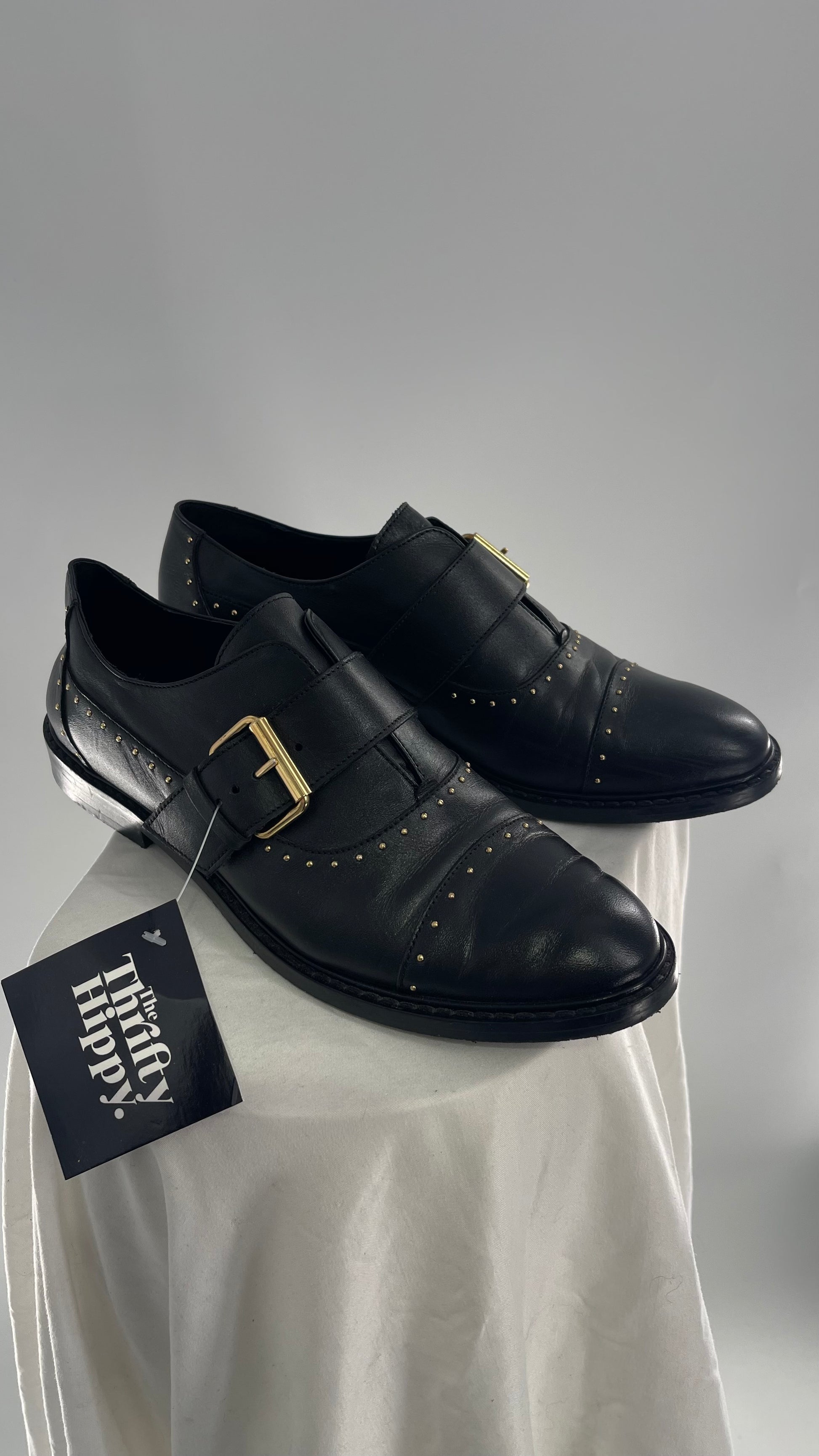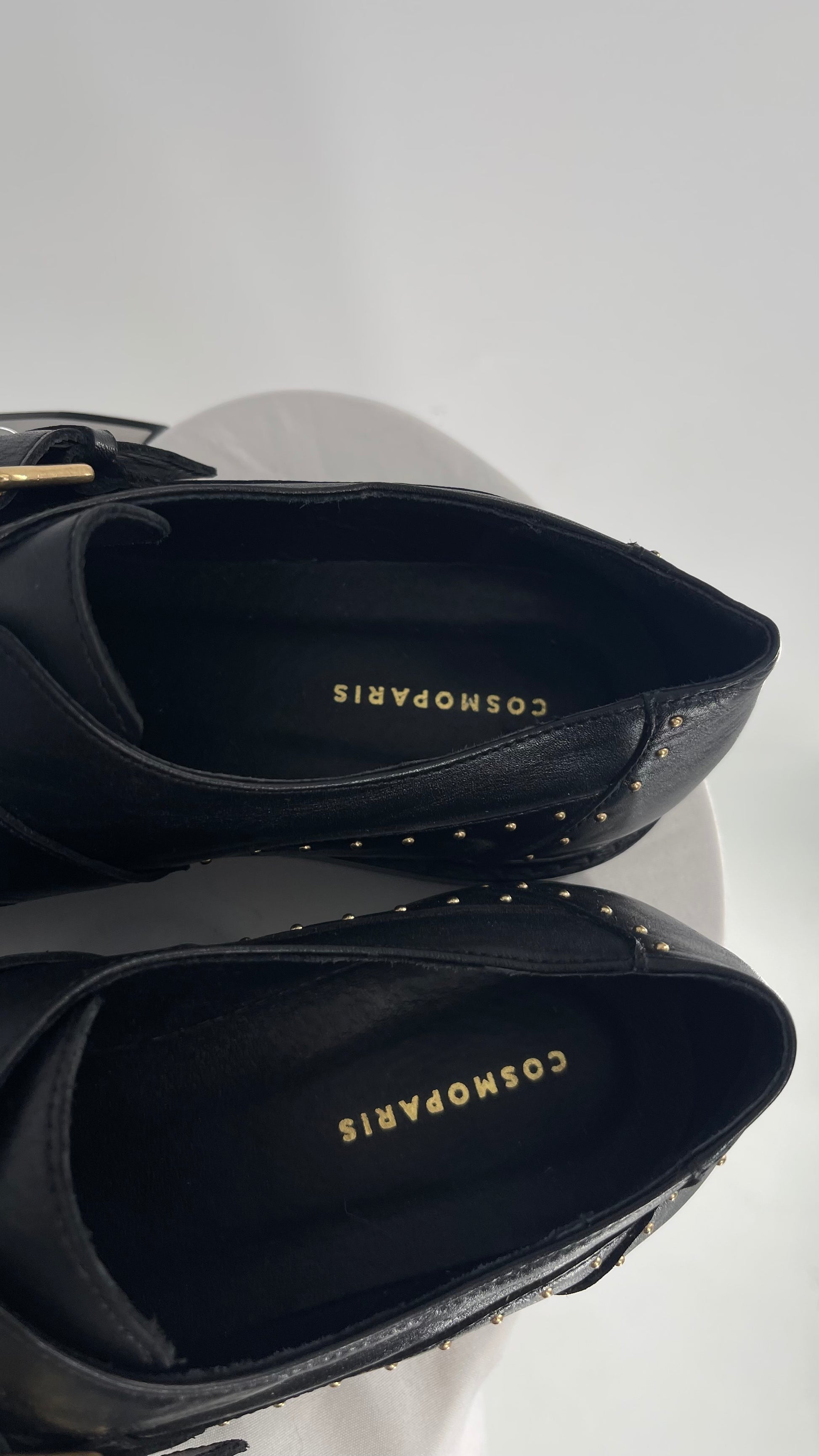 Vintage COSMOPARIS Black Leather Side Buckle Oxford with Gold Stud Details (39)