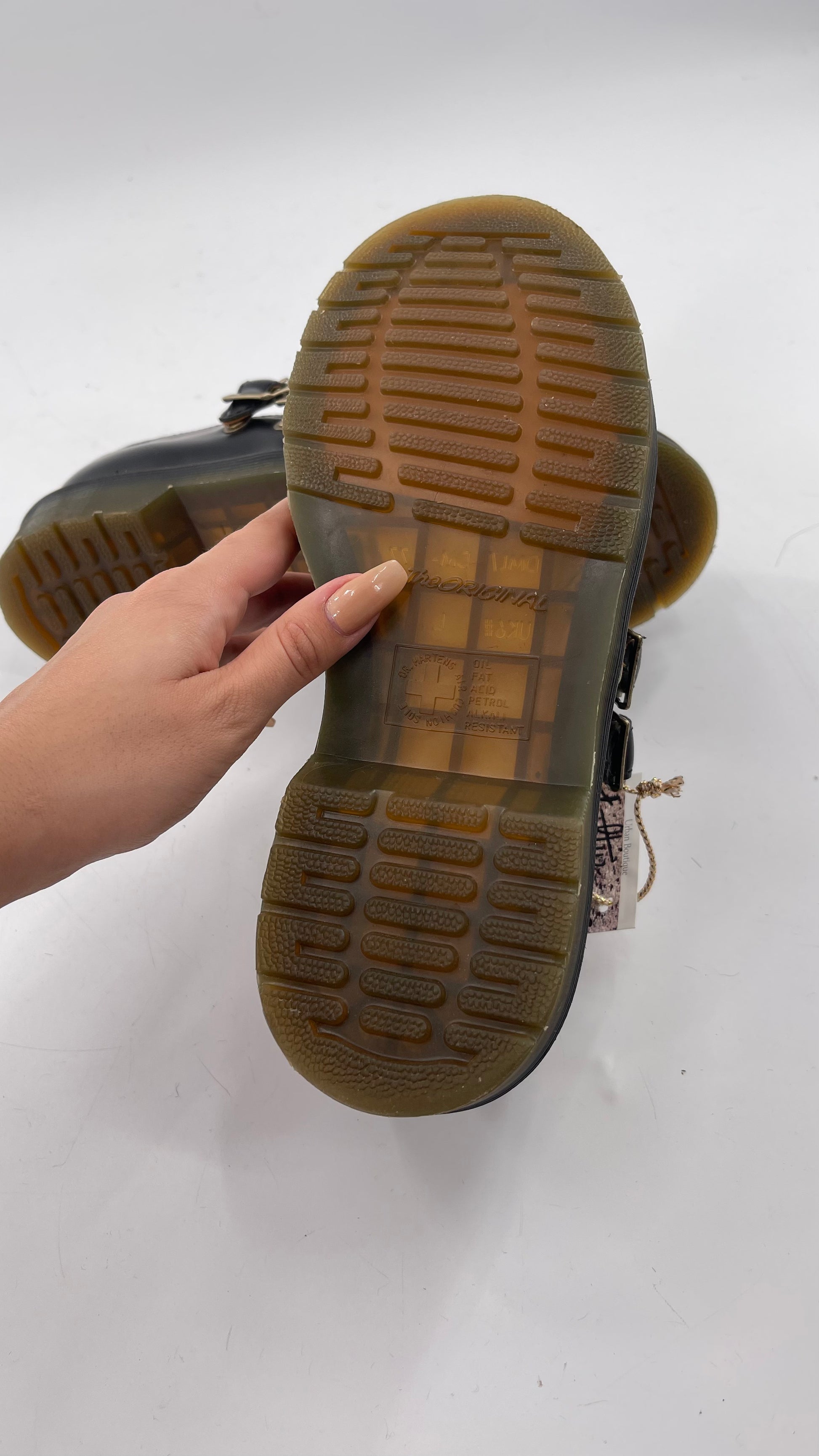 Dr. Martens black patent leather academia Mary Janes with brass/gold logo embossed buckles and engraved logo on sides
