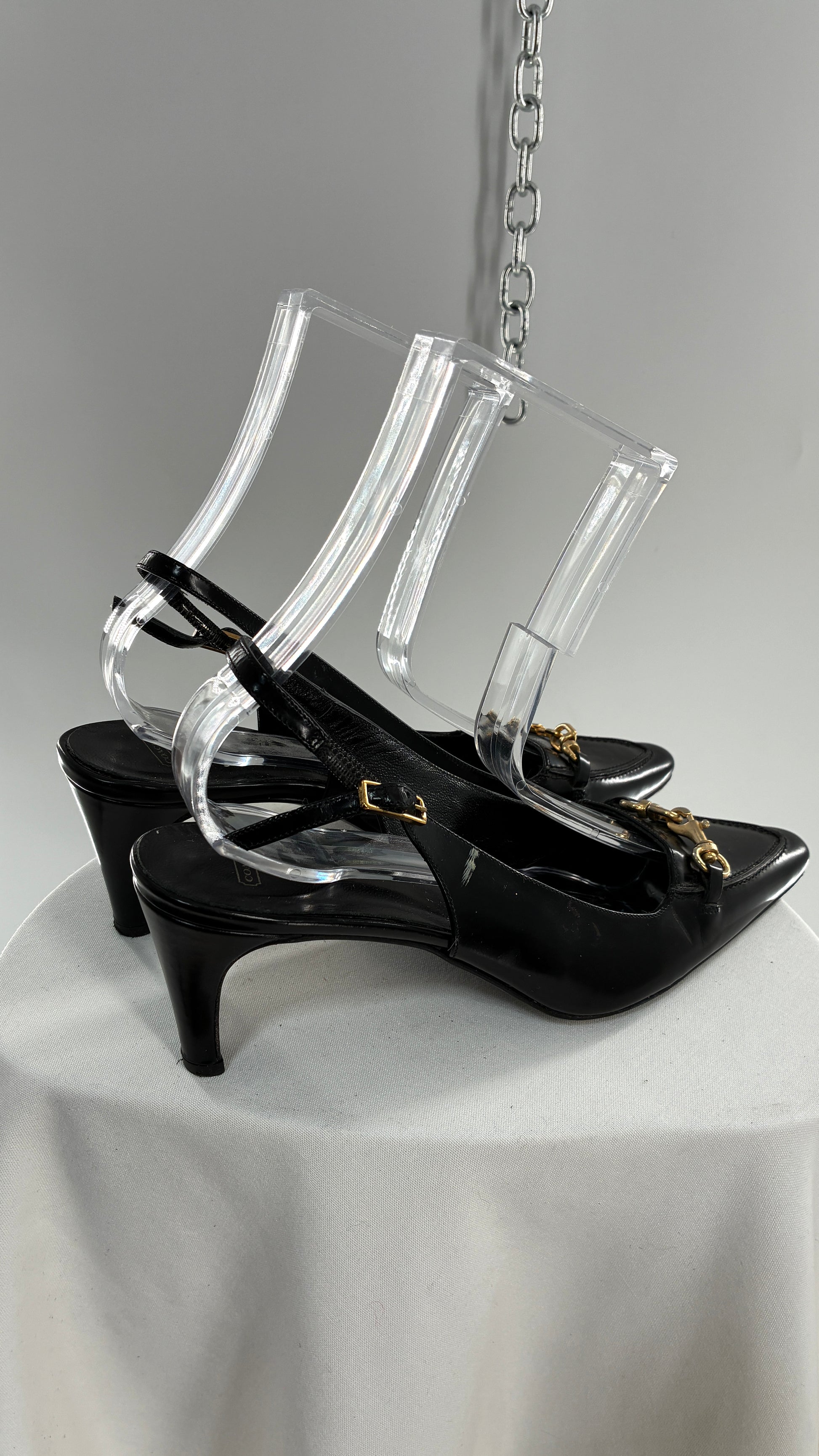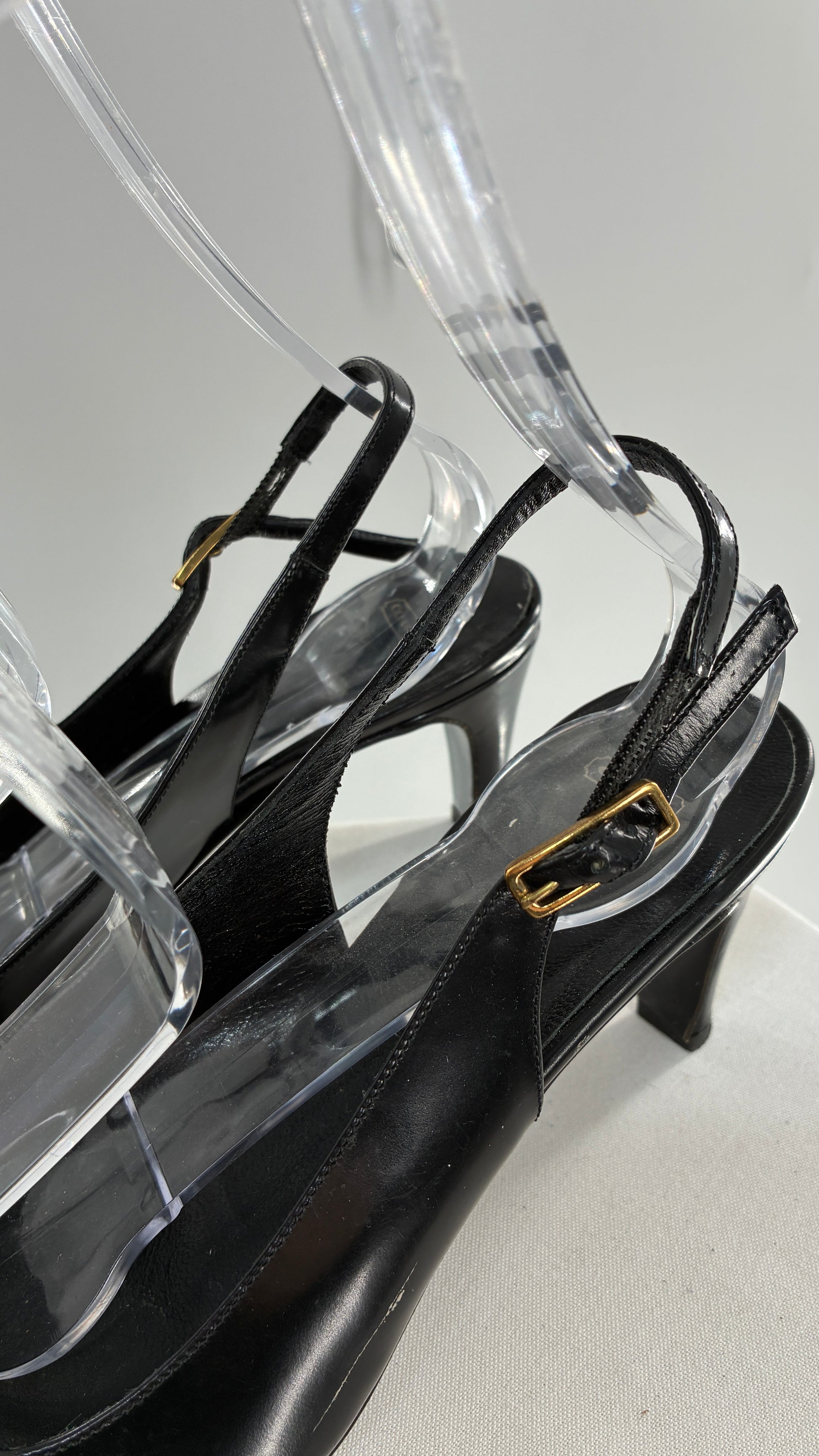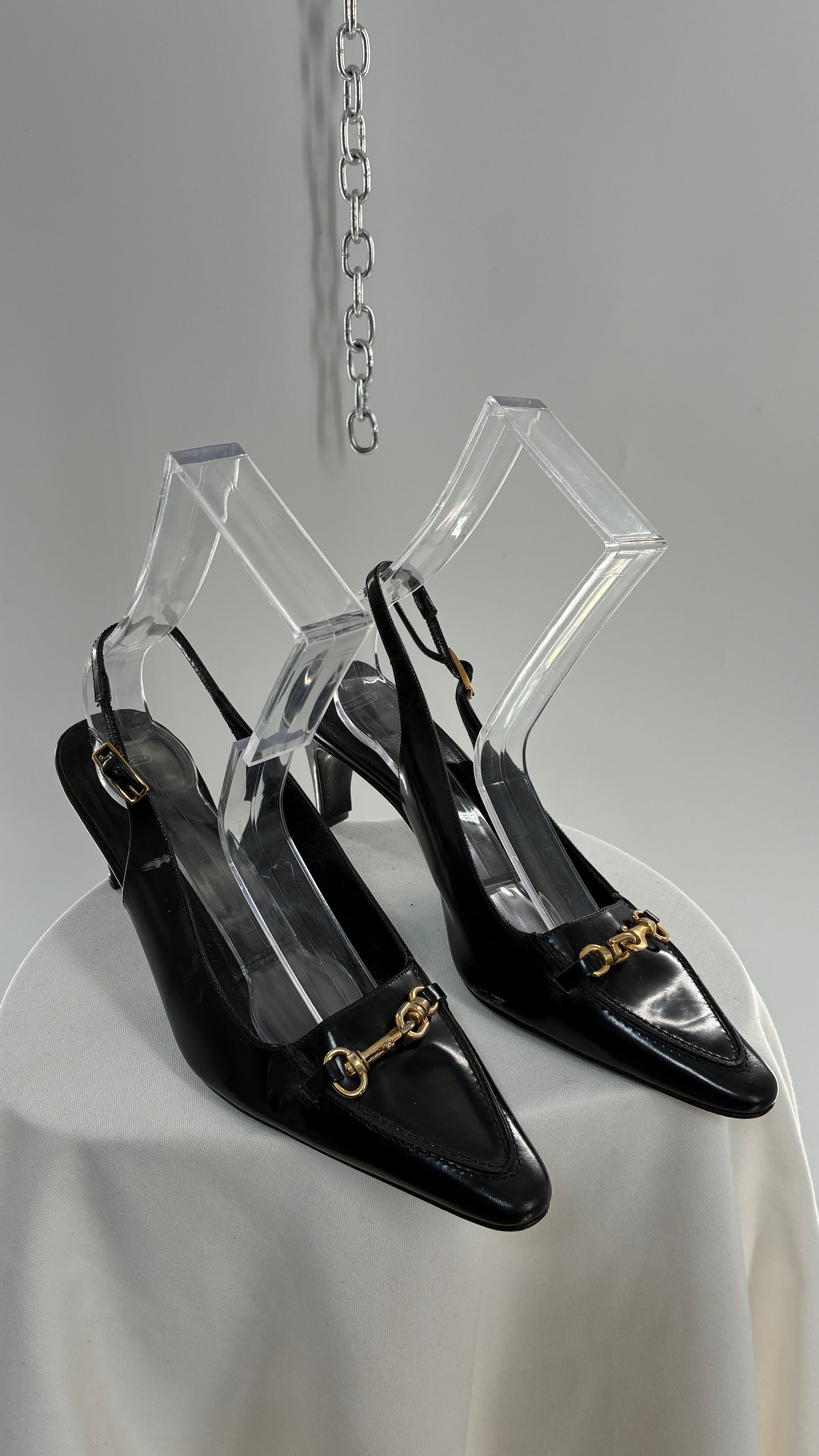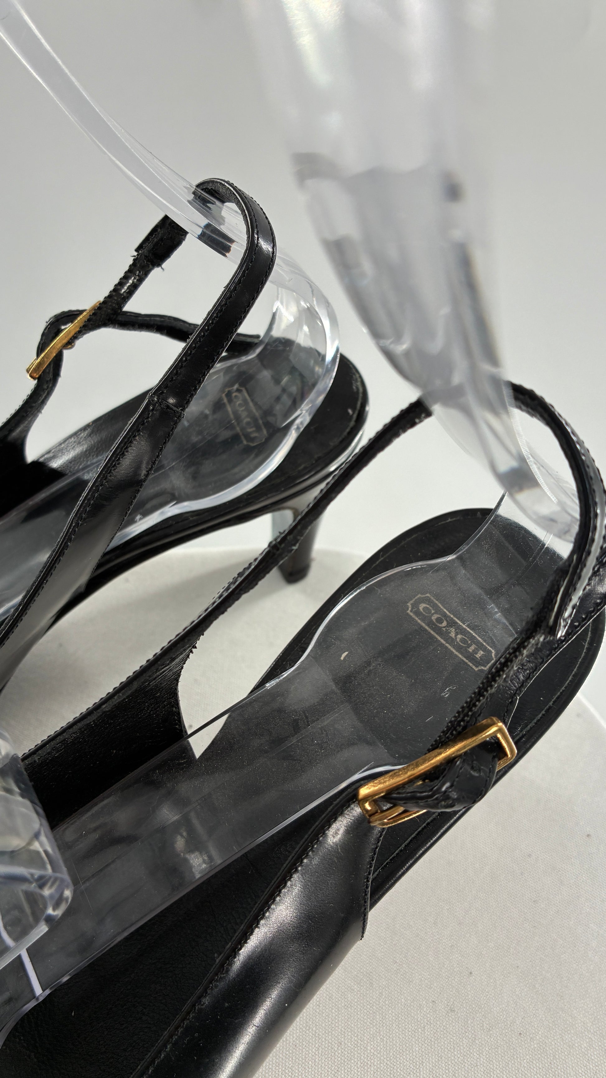 Vintage COACH Black Patent Leather Sling Back Kitten Heel with Brass Closure Detail (8.5)